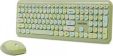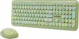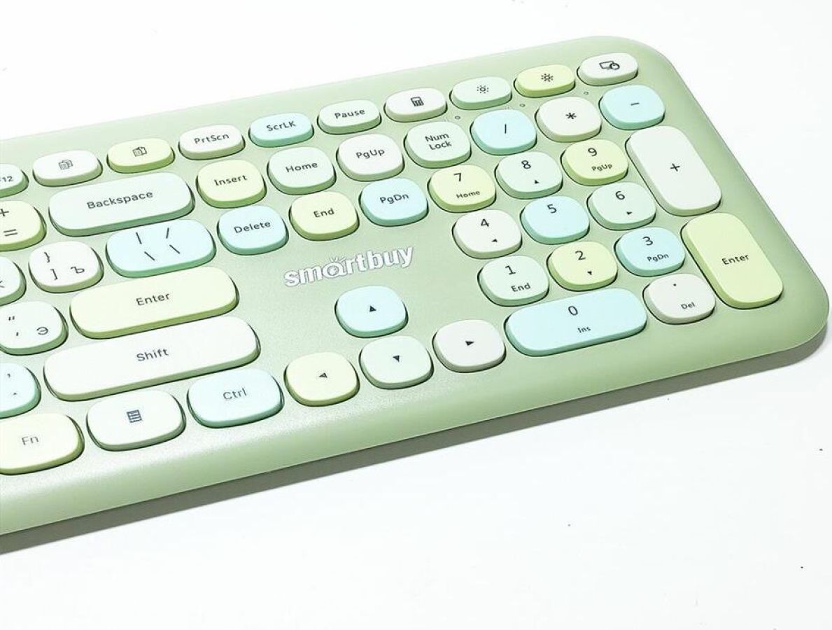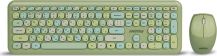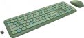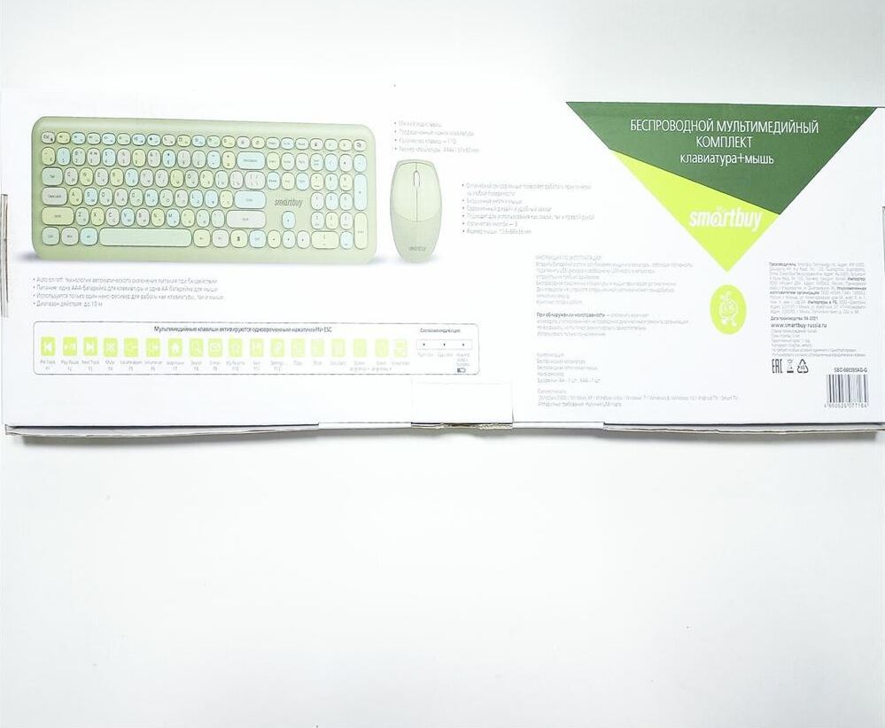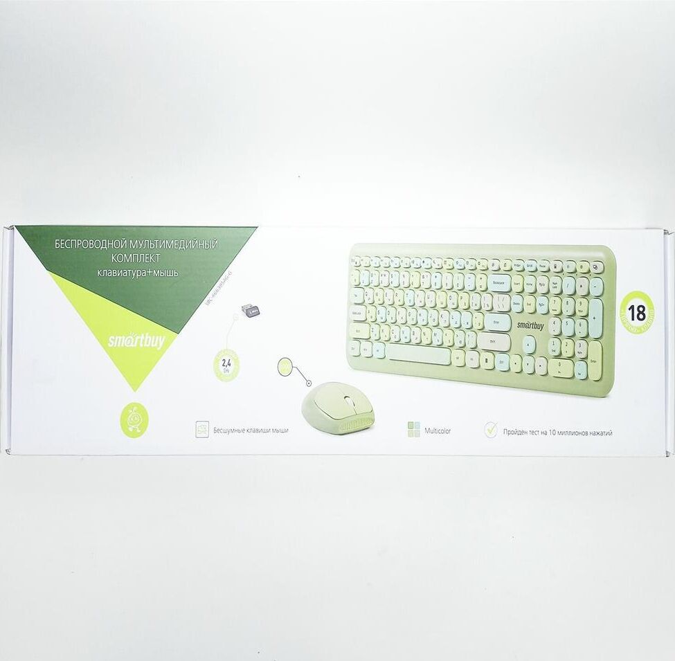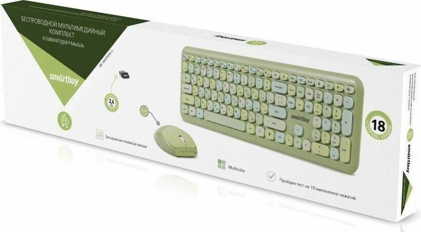 Цвет мыши: зеленыйТип сенсора: ОптическийКоличество кнопок мыши: 3Радиус действия: до 10 мПитание мыши: 1 батарейка ААРазрешение мыши (dpi): 1000Интерфейс подключения: USBЦвет клавиатуры: белыйПитание клавиатуры: 1 батарейка ААА