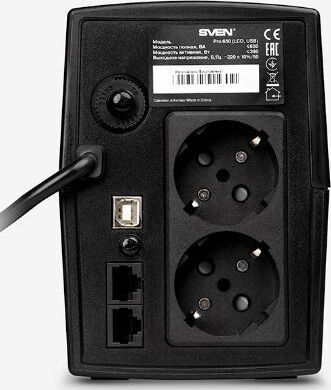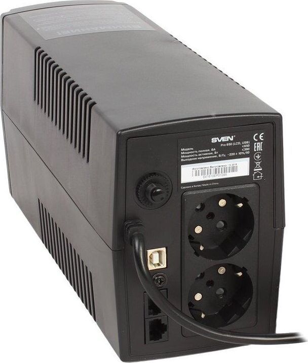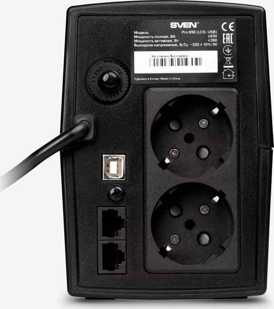 ИБП линейно-интерактивный, Тип нагрузки компьютер, монитор, Мощность полная, ВА 650, Мощность активная, Вт 390, Максимальная нагрузка, Вт 390, Уровень входного напряжения, В~ 175 - 280 ± 3%, Уровень выходного напряжения, В~ 220 ± 10 %, Форма выходного напряжения апроксимированная синусоида, AVR (авторегулятор напряжения), Входная частота, Гц 50, Рабочая частота, Гц 50 ± 1 % (в режиме работы от батареи), Коммуникационный порт USB, RJ-45, Входная вилка 1 хСЕЕ7/7, Выходные розетки, шт 2хCEE7/4, Поддерживаемые интерфейсы USB, Защита перегрузка (AVR +25% 60 сек, BAT +10% 10 сек), короткое замыкание, защита от перезаряда или саморазряда батарей, Типовое время переключения, мс 10, Продолжительность работы от батарей, мин. 3-20, в зависимости от подключаемой нагрузки, Тип аккумуляторов герметичные необслуживаемые свинцово-кислотные батареи (являются расходным материалом), Напряжение батарей, В 12, Емкость батареи, А*ч 7,Время подзаряда 6-8 часов (до уровня >90 %), Индикаторы питание от батареи, работа от сети, заряд