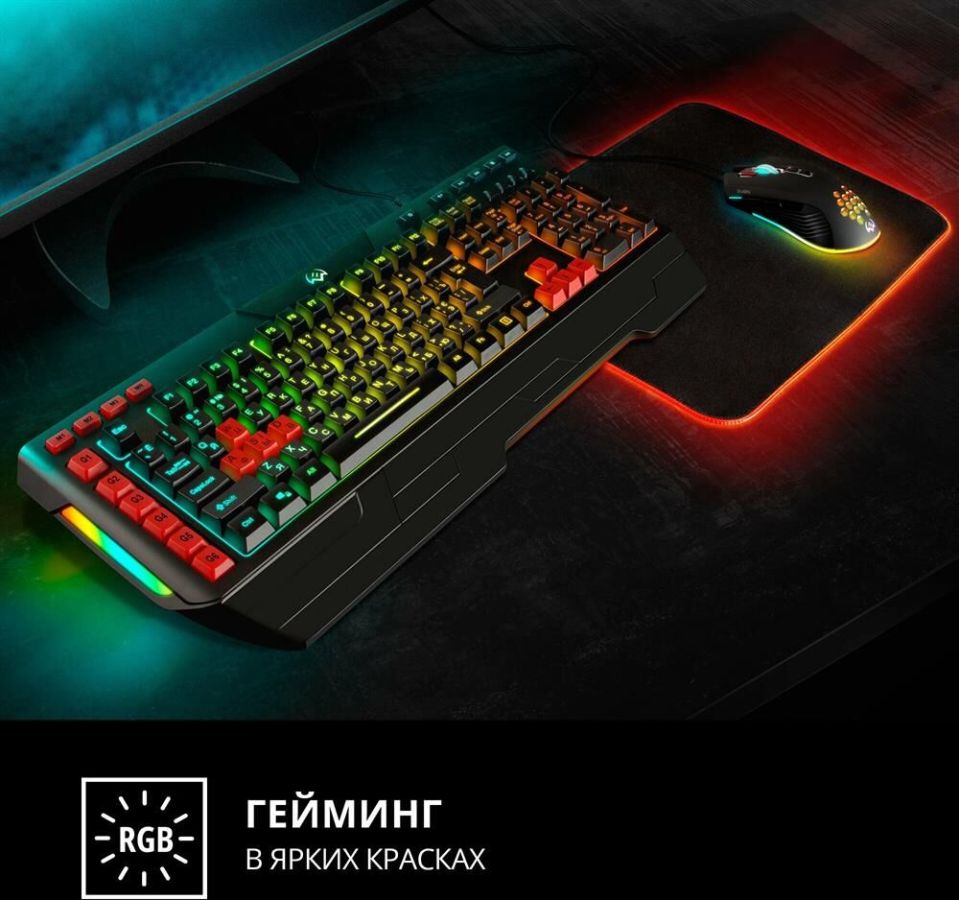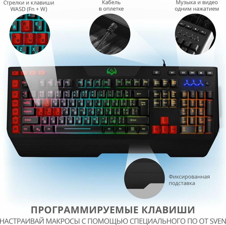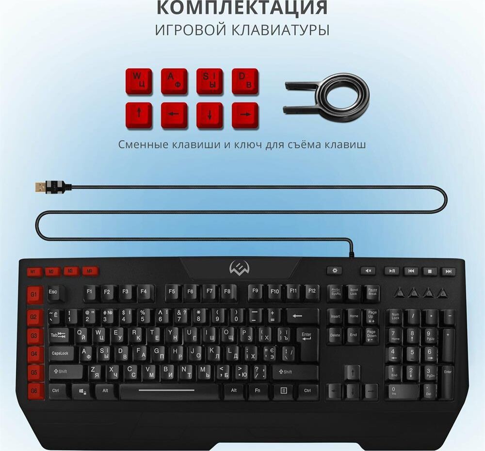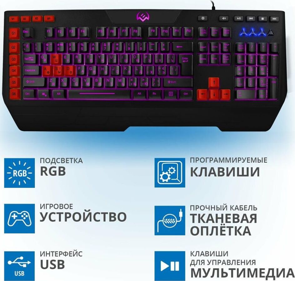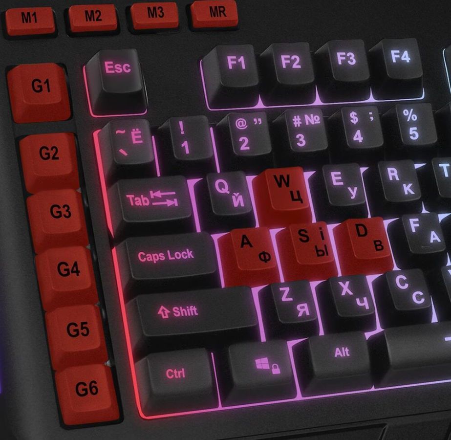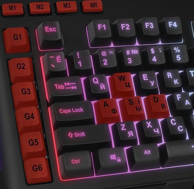 Клавиатура игровая, программируемая, проводная, интерфейс USB, количество клавиш - 120, клавиш быстрого доступа - 16, возможность записи макросов, подавление фантомных нажатий, 7 переключаемых цветов подсветки, длина кабеля - 1,8 м.