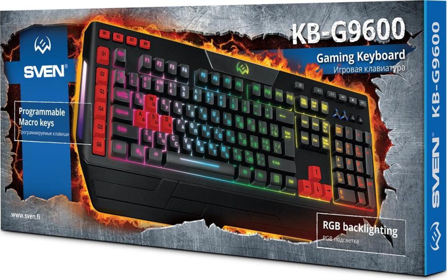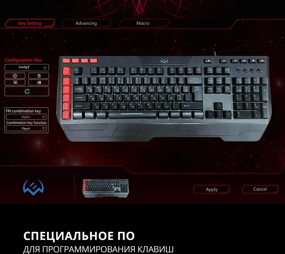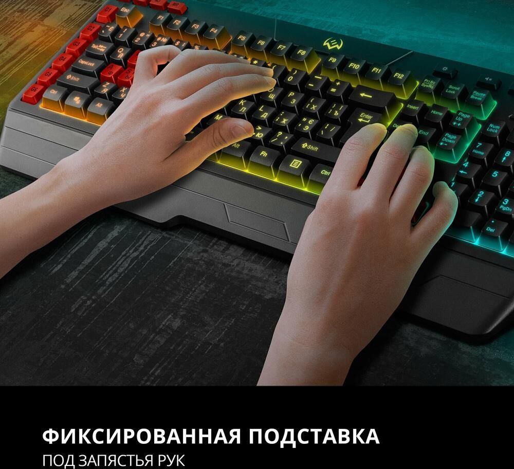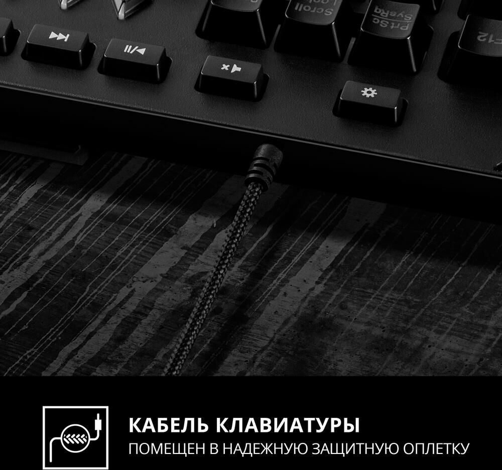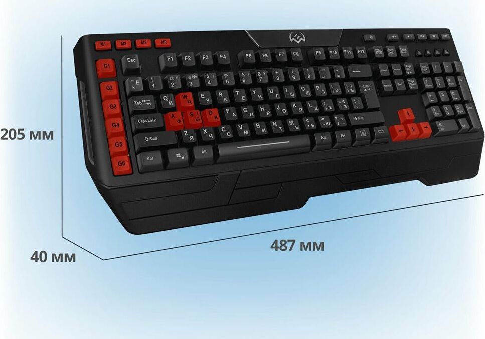 Клавиатура игровая, программируемая, проводная, интерфейс USB, количество клавиш - 120, клавиш быстрого доступа - 16, возможность записи макросов, подавление фантомных нажатий, 7 переключаемых цветов подсветки, длина кабеля - 1,8 м.