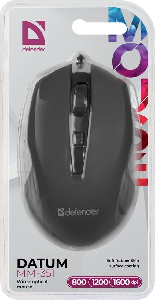 Мышь проводная, интерфейс подключения USB, тип сенсора - оптический, количество кнопок 5 + колесо-кнопка, изменяемое разрешение 800/1200/1600 dpi, покрытие Soft Rubber Skin, длина кабеля - 1,5 м.