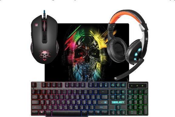 Игровой набор 4-в одном (гарнитура+клавиатура+мышь+коврик) проводной, интерфейс USB, гарнитура - импеданс (наушники) 32 Ом, импеданс (микрофон) 2.2 кОм,чувствительность (наушники) 110±3 дБ, чувствительность (микрофон) 42±3 дБ, частотный диапазон (наушники) 20–20000 Гц, длина кабеля- 1.8 м; клавиатура - количество клавиш - 104, увеличенная площадь клавиш, радужная подсветка; мышь - оптическая, количество кнопок - 5, колесо прокрутки, изменяемое разрешение - 800/1800/2400/3200 dpi, прорезиненное покрытие, переливающаяся подсветка; коврик - материал - термически обработанная ткань + натуральная резина, поверхность - Speed, размер - 280*230*3 мм.