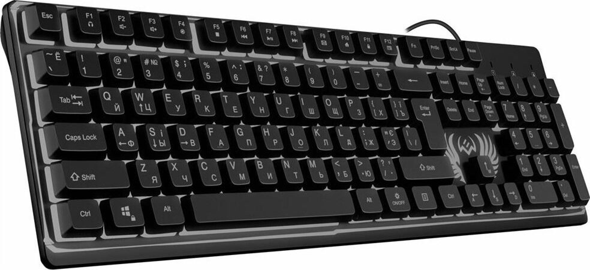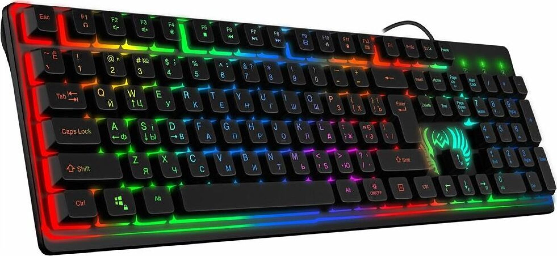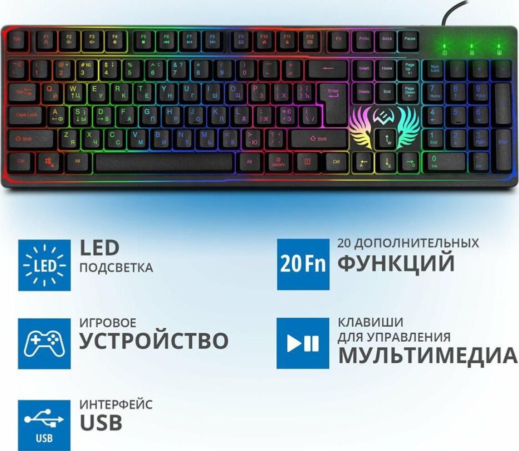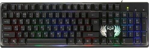 Клавиатура игровая, проводная. Оборудована разноцветной подсветкой с регулировкой яркости и «дышащим» режимом, позволяющей создать на игровом месте как агрессивную среду для онлайн-шутеров, так и атмосферу сосредоточения и концентрации для квестов и стратегий. 20 дополнительных (Fn) функций. Переключение режимов между клавишами WASD и стрелками. Количество клавиш - 105. Кол-во клавиш быстрого доступа - 20. Тип: мембранная. Интерфейс - USB. Длина кабеля - 1,8 м. Размеры изделия - 435*135*30 мм. Вес - 422 г.
