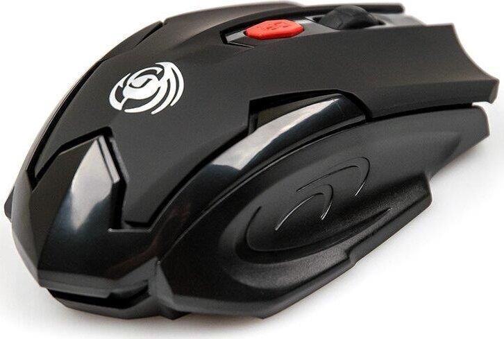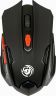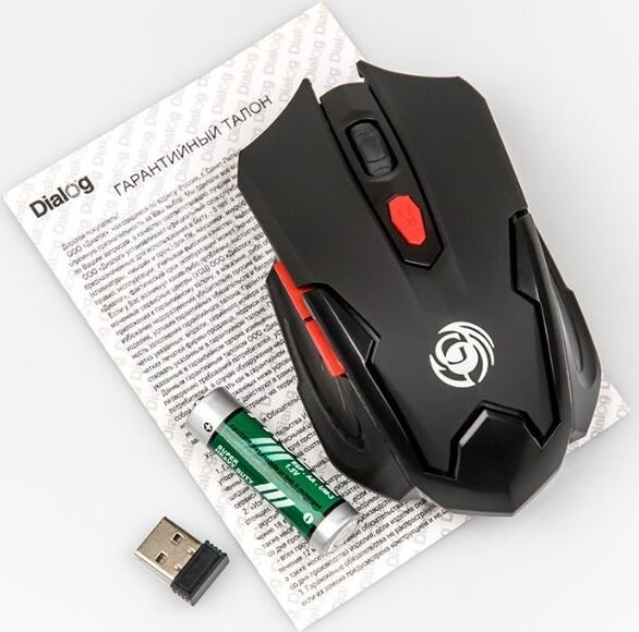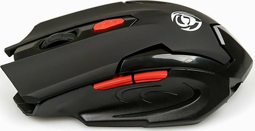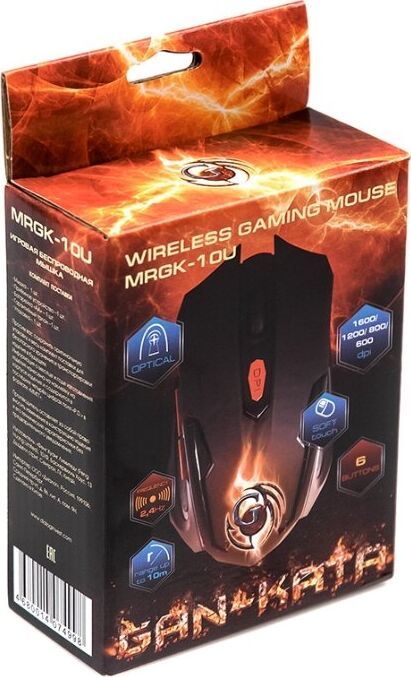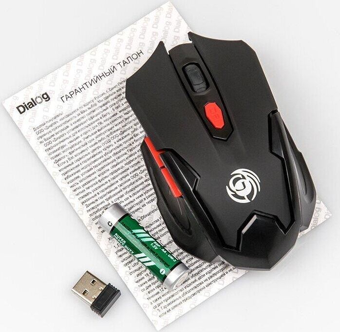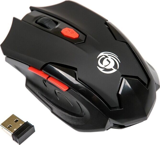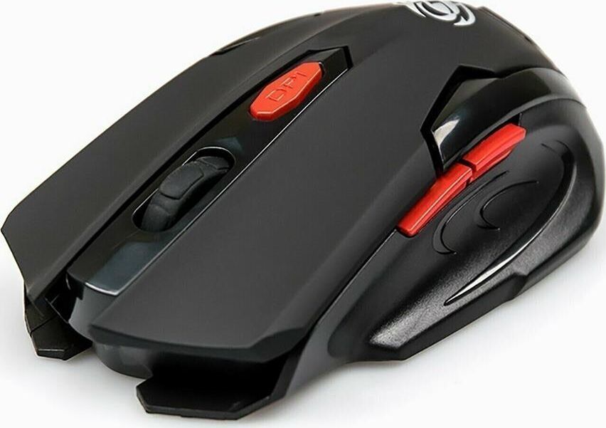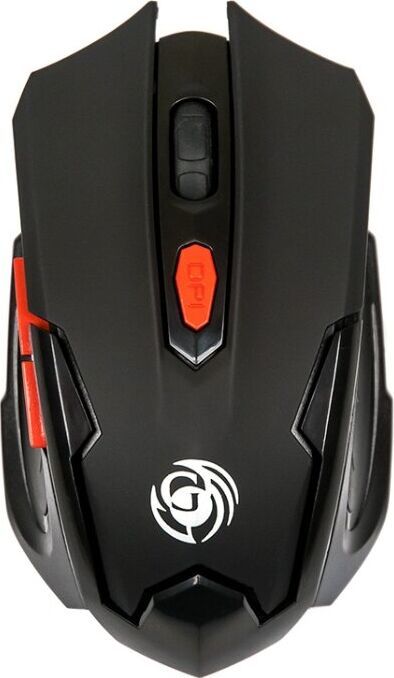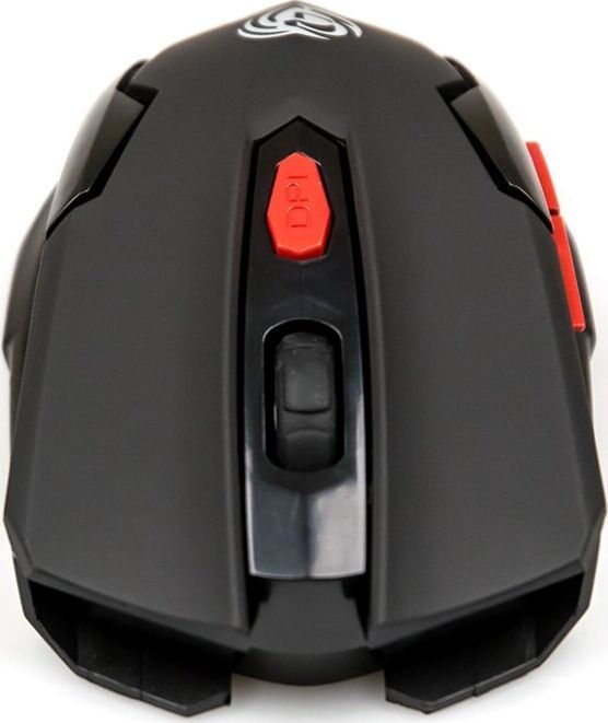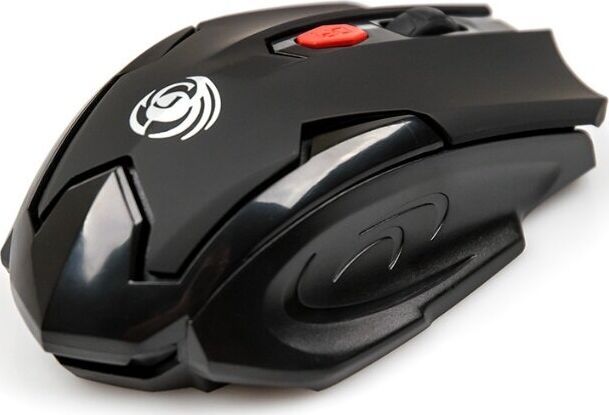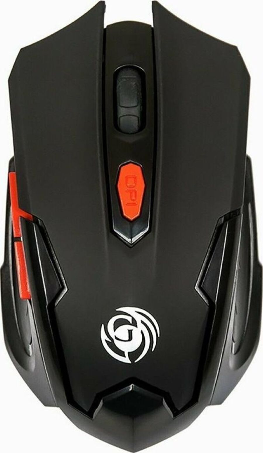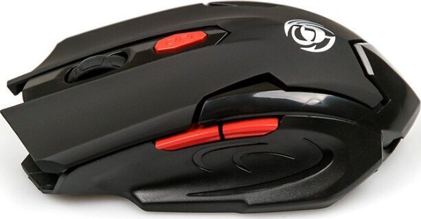 Мышь игровая, беспроводная, оптическая, радиоинтерфейс 2.4 гГц, динамически изменяемое разрешение 600/800/1200/1600, количество кнопок - 6, вертикальная прокрутка, материал корпуса - матовый черный пластик, верхняя панель с кнопками - пластик софт-тач, красные дополнительные кнопки.