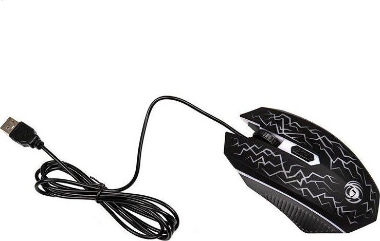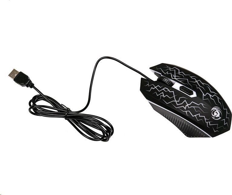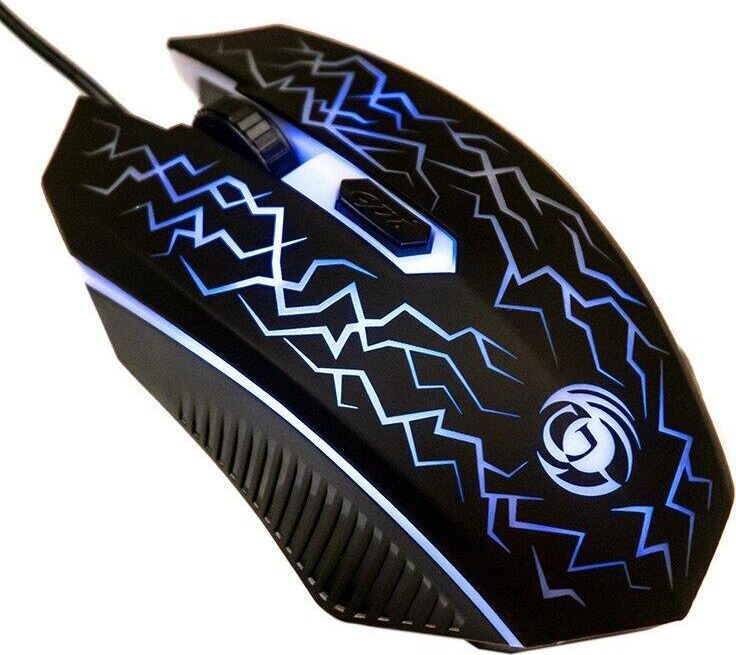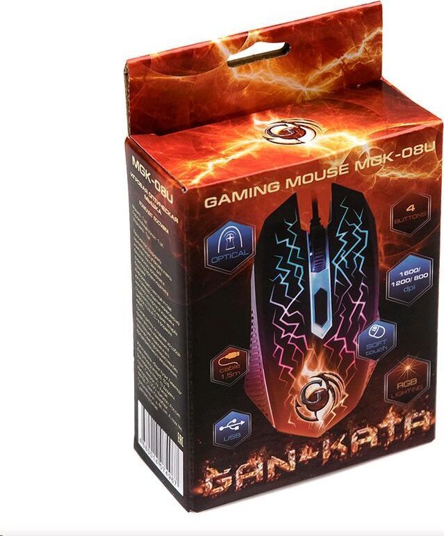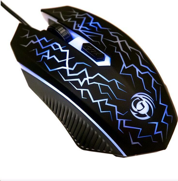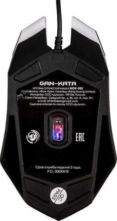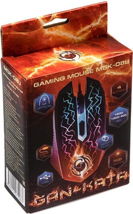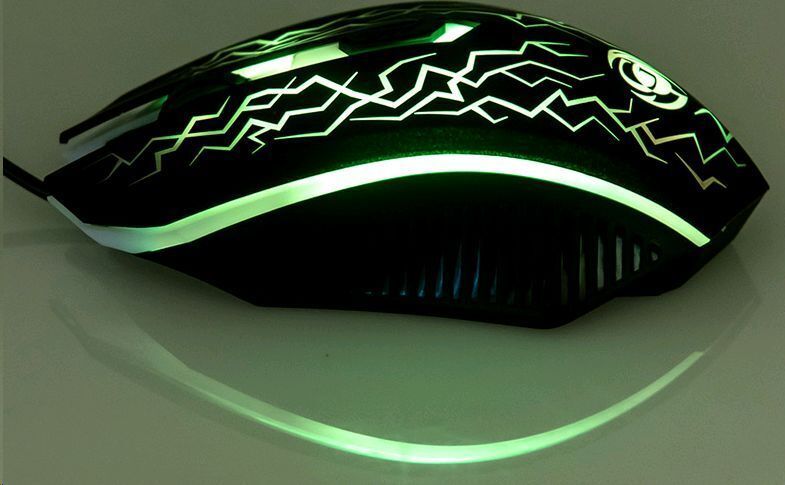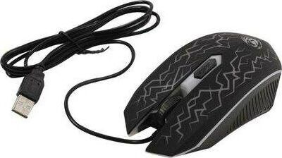 Игровая оптическая проводная мышь с подсветкой. Крупная симметричная мышь - подходит одинаково и для правшей, и для левшей. Подсветка красная, зеленая, синяя, фиолетовя, голубая - сменяется циклически. Матовый черный пластик, верхняя панель с кнопками - пластик софт-тач. Вставки из полупрозрачного светлого пластика (подсветка). Динамически изменяемое разрешение циклически центральной кнопкой (800/1200/1600 dpi). Количество кнопок - 4. Длина шнура - 1,5 м. Размер - 125*70*33 мм. Вес - 71 г.
