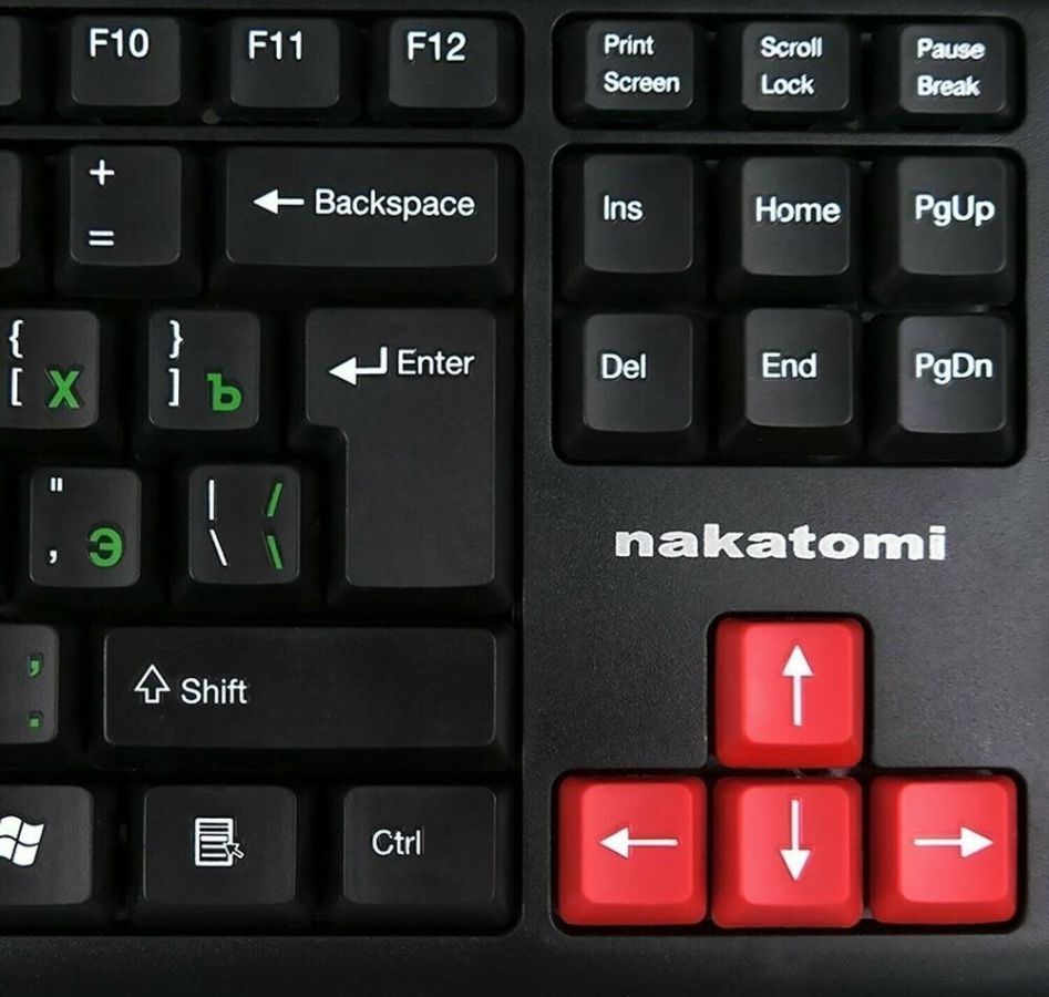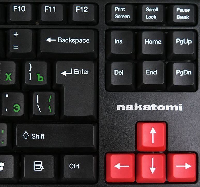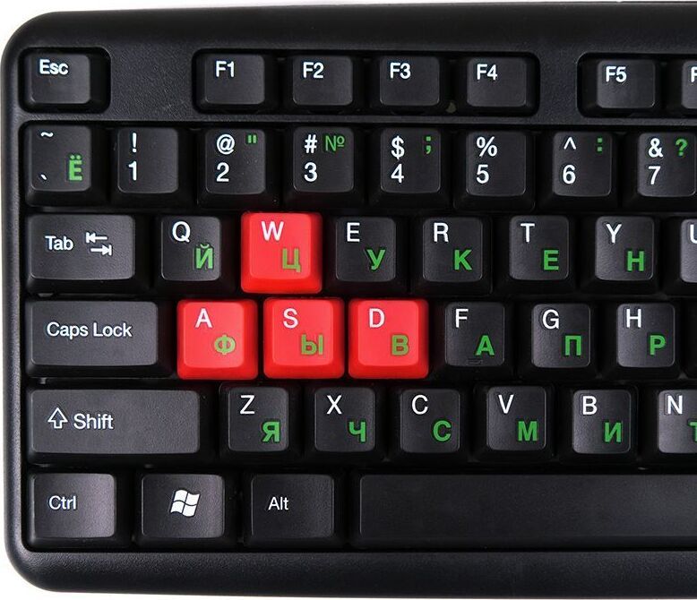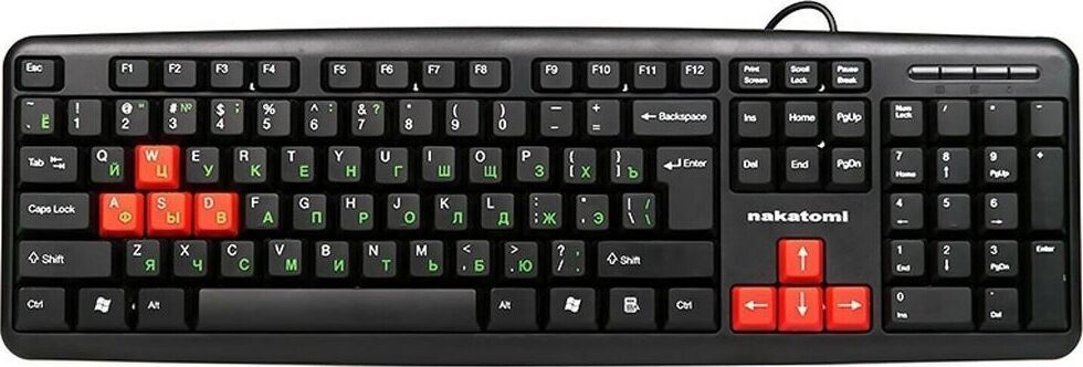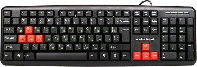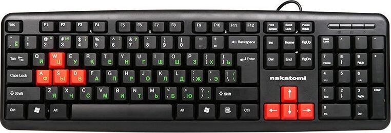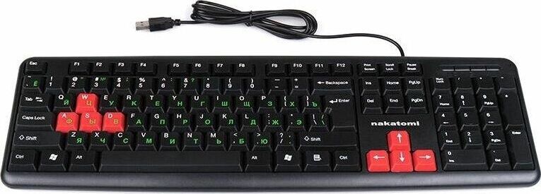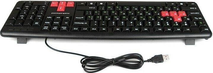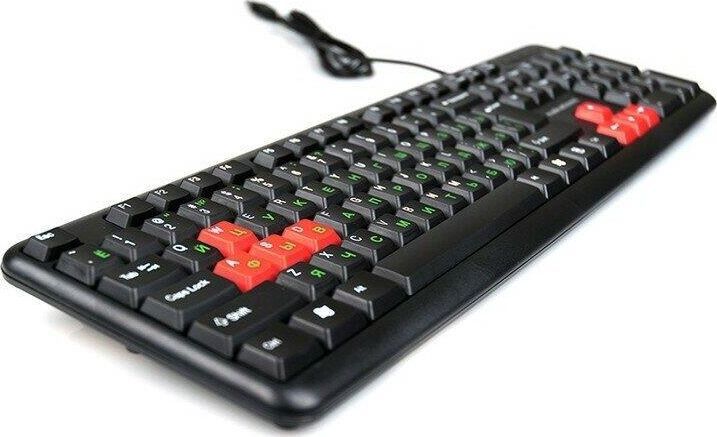 Интерфейс: USB, Корпус: Пластик, черный. Латиница - белый цвет, кириллица - зеленый, Количество клавиш: 104, Клавиши Windows, Регулируемый угол наклона, Длина кабеля, м: 1.5.