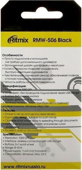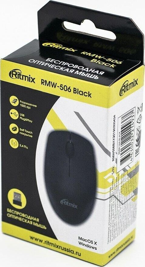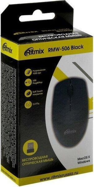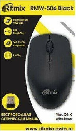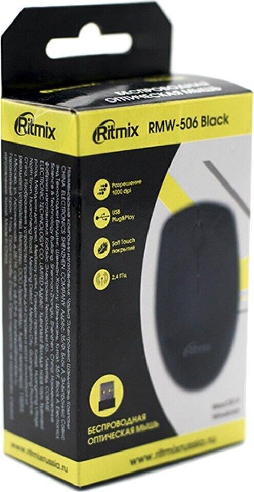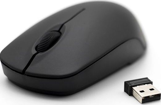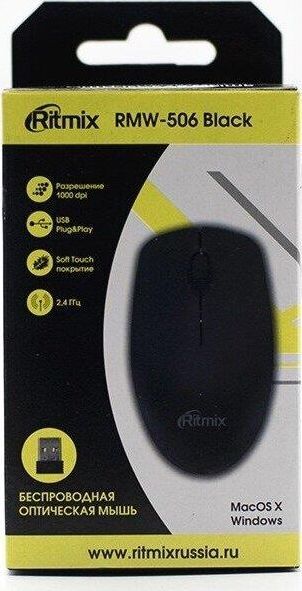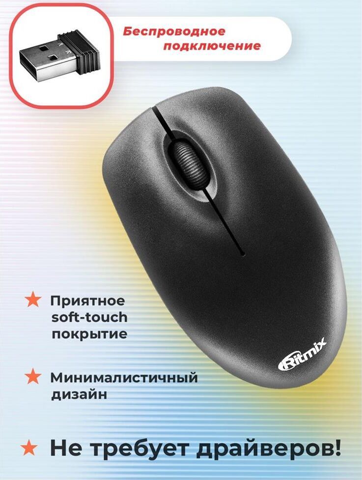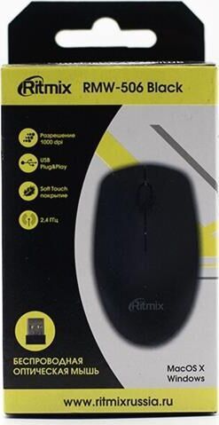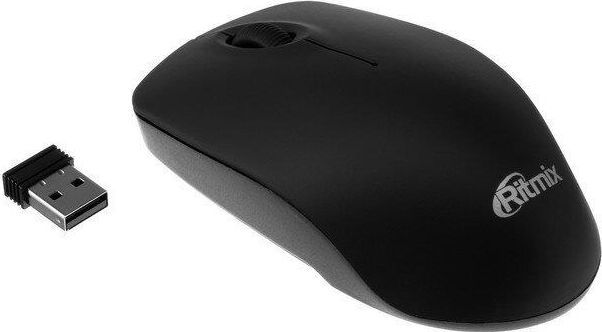 Мышь беспроводная, оптическая, 2 кнопоки , колесо-кнопка, оптическое разрешение 1000 dpi, интерфейс - беспроводной USB-адаптер, Soft Touch покрытие, цвет - черный.