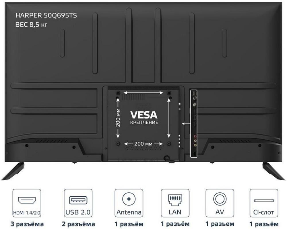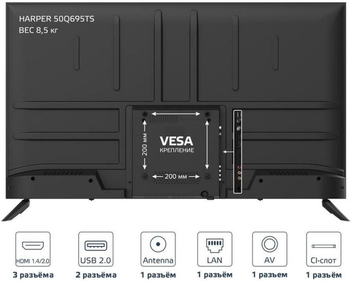 Диагональ экрана: 50 Разрешение: 3840х2160 Разрешение экрана: 4K UHD Функция HDR: да Формат экрана: 16:9, 4:3, Авто Тип подсветки экрана: QLED Углы обзора: 178° Дизайн рамки: Frameless design Тип панели: VA Частота обновления экрана: 60 Гц Время отклика пикселя: 8 мс Яркость: 280 Кд/м2 Контрастность: 120000:1 Количество цветов: 1 млрд. Цветовой фильтр: RGB Цифровые тюнеры: DVB-S2, DVB-T2, DVB-C Поддержка PAL: да Поддержка SECAM: да Поддержка NTSC: да Прием звука: да Встроенная акустика: 20 Вт (2x10 Вт) Декодер стереозвука NICAM/A2: да Эквалайзер: да Объемное звучание: да Поддержка форматов изображений: JPEG, BMP, PNG, MPO Стереозвук: да Антенный вход: да Dolby audio: да Воспроизведение с внешних носителей: да (NTFS, FAT 32) Запись на внешние носители: да (FAT 32) Поддержка видеоформатов/кодеков: MPEG2, MPEG4, AVI, Xvid, FLV, MOV, VOB, MKV, HEVC Поддержка аудиоформатов/кодеков: AC3, EAC3, MP3, AAC, M4A, WMA Разъемов HDMI: 3