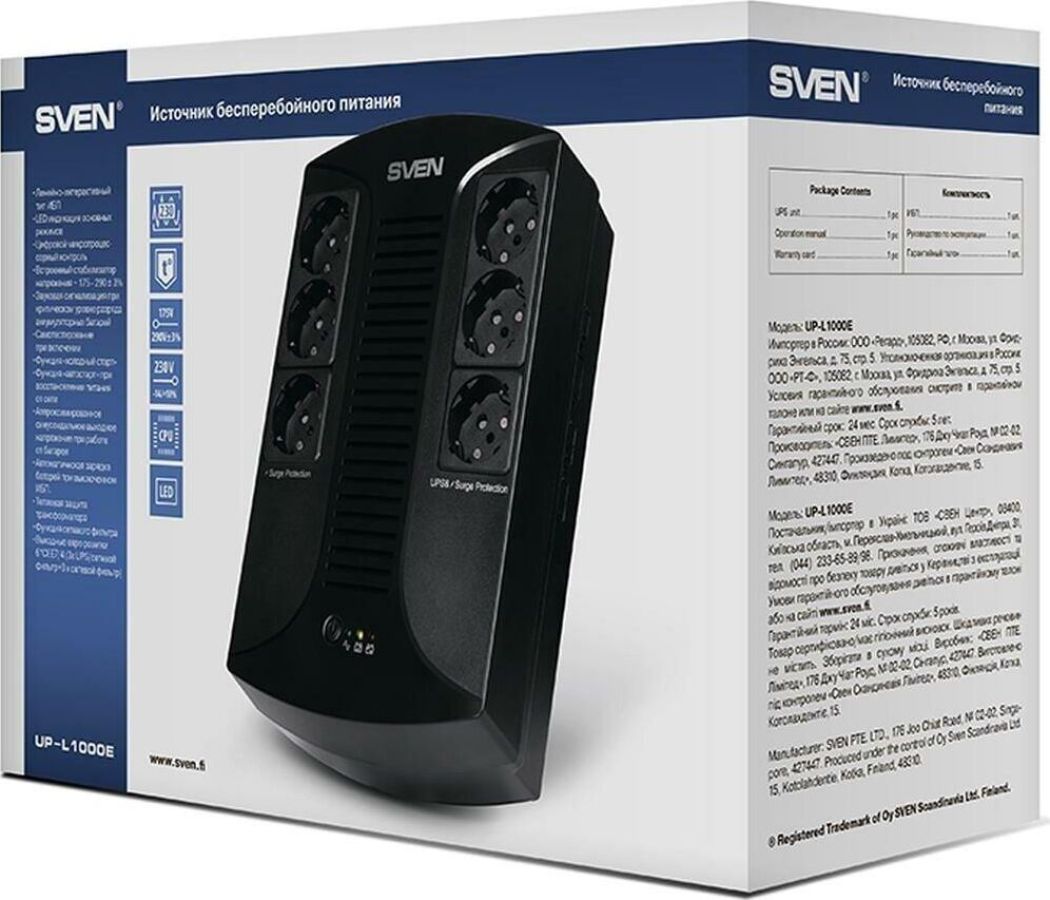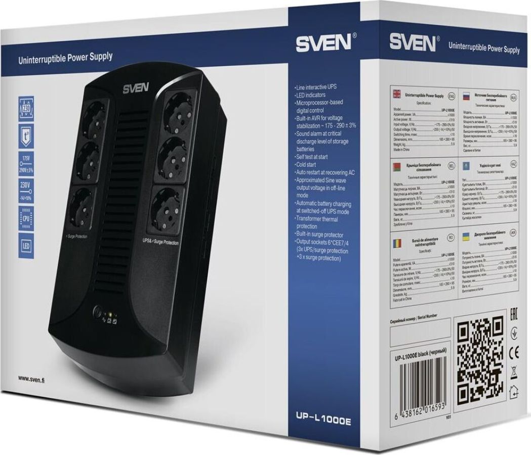 ИБП линейно-интерактивный, встроенный стабилизатор напряжения, мощность полная, ВА - 1000, мощность активная, Вт - 510, уровень входного напряжения, В~175-290±3%/50, уровень выходного напряжения, В~230 (-14/+10%)/50, выходные розетки - 6х CEE7/4 (3х UPS/сетевой фильтр + 3x сетевой фильтр), защита от перегрузки по току, короткого замыкания, напряжение батарей, В12, емкость батареи, А*ч9, размеры изделия, (мм) - 185х280х95.