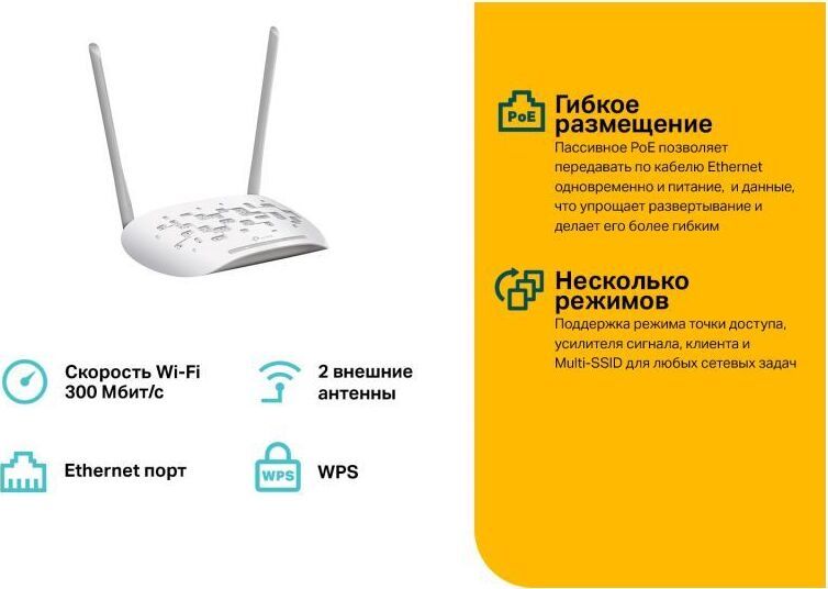 Точка доступа TP-Link TL-WA801N Скорость беспроводной передачи данных до 300 Мбит/с — идеальное решение для просмотра HD-видео, нтернет-звонков и онлайн-игр Поддерживает несколько режимов работы: точка доступа, Multi-SSID, клиент, усилитель Wi-Fi сигнала Защищает домашнюю сеть с помощью шифрования WPA2 и обеспечивает быстрое подключение одним нажатием кнопки Питание по пассивному PoE на расстоянии до 30 метров с помощью инжектора Power over Ethernet Характеристики Стандарт Wi-Fi: WiFi 4 (802.11n) Диапазоны Wi-Fi: 2.4 ГГц Установка: Настольный POE: нет Скорость Wi-Fi (частота 2.4 ГГц): 300 Кол-во антенн: 2 Комплект MESH-систем: 1 Подключение (WAN): LAN Порты Ethernet: 1 Скорость Ethernet портов: 10/100 Мбит/с USB-порт: нет