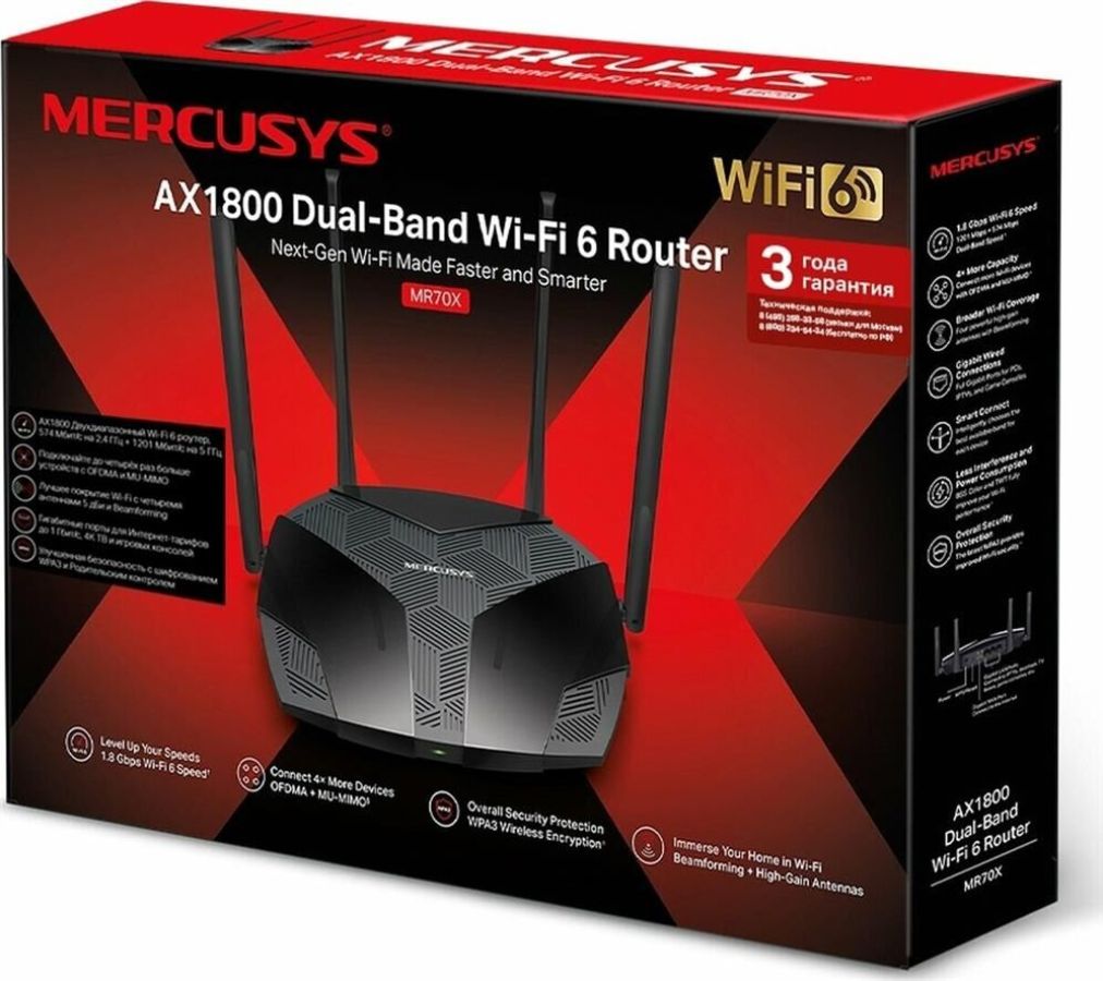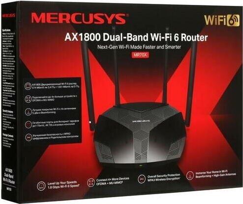 AX1800 Двухдиапазонный Wi-Fi 6 роутер. Wi-Fi 6 — скорость до 1,8 Гбит/с (до 1201 Мбит/с на 5 ГГц и до 574 Мбит/с на 2,4 ГГц). В четыре раза больше подключений — технологии OFDMA и MU-MIMO позволяют обмениваться данными сразу с несколькими устройствами, улучшая общую эффективность работы сети. Надёжная защита — новейший стандарт шифрования WPA3 обеспечит высокую безопасность Wi?Fi сети. Гигабитная скорость по кабелю — передавайте данные на умопомрачительной скорости. Энергосбережение — технология Target Wake Time (TWT) снижает энергопотребление мобильных и IoT?устройств при передаче данных. Меньше Wi-Fi помех — BSS color позволит свести к минимуму помехи от других сигналов для улучшения качества подключения.