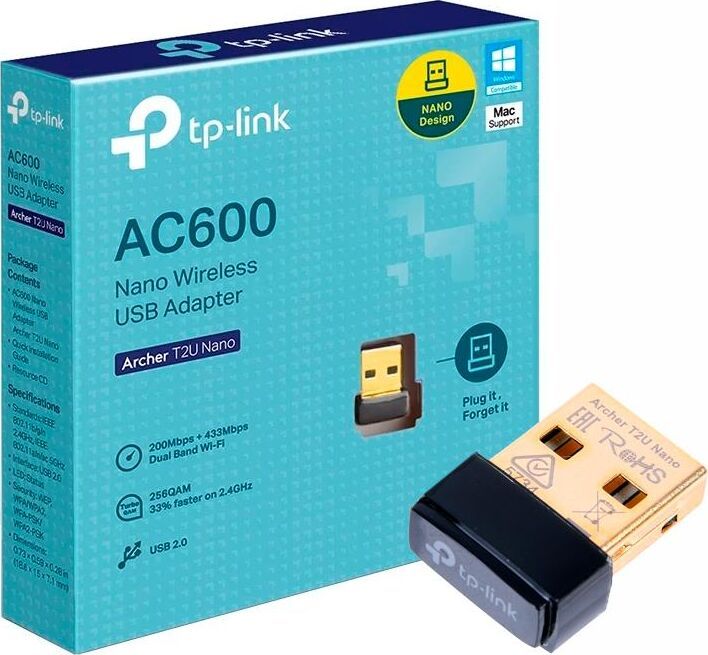Модель: Archer T2U NANO. Стандарт передачи данных: Wi-Fi. Интерфейс с компьютером, USB 2.0: Powerline. Шифрование данных: 64/128-битное WEP: Wi-Fi. Класс WiFi: AC600. Диапазон Wi-Fi: 2.4ГГц / 5ГГц. Стандарт Wi-Fi 802.11a: поддерживается. Стандарт Wi-Fi 802.11b: поддерживается. Стандарт Wi-Fi 802.11g: поддерживается. Стандарт Wi-Fi 802.11: nподдерживается. Стандарт Wi-Fi 802.11n (150 Mbps): поддерживается. Стандарт Wi-Fi 802.11ac: поддерживается. Стандарт WEP: есть. Стандарт WPA: есть. Стандарт WPA2: есть. Максимальная скорость Wi-Fi: 433 Мбит/c. Тип разъема: USB 2.0