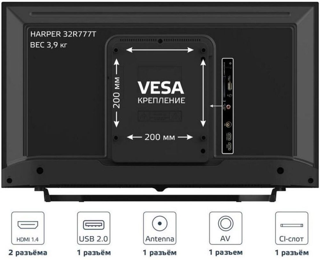 "Диагональ экрана 32"" (81 см)HD frameless Системы цветности аналогового ТВ: SECAM, PAL Цифровой тюнер DVB/T2/C Декодеры стереозвука NICAM, А2, АСЗ Формат изображения: 16:9 Разрешение экрана 1366х768 Динамический контраст 70000:1 Яркость 230 кд/м2 Угол обзора (гор/верт) 178°/178° Цифровой 3D фильтр Количество цветов 16,7 млн. Время отклика 6,5 мс Меню на русском , английском языках Телетекст Аудио 2 х 6 Вт Входы/выходы: Антенный вход Композитный AV вход mini 2 х HDMI 1 х USB CI слот SPDIF (СОАХ) Питание: Напряжение 1 ОО-240В ~ 50/60Гц Максимальная потребляемая мощность 48 Вт Потребляемая мощность в режиме ожидания - 0,5 Вт Удельная мощность рабочего режима: 0,017 Вт/кв.см Потребляемая мощность в выключенном режиме: О Размеры с подставкой: 724х480х180 мм Размеры без подставки: 724х434х84 мм Вес: 3,9кг VESA: 200х200 мм"