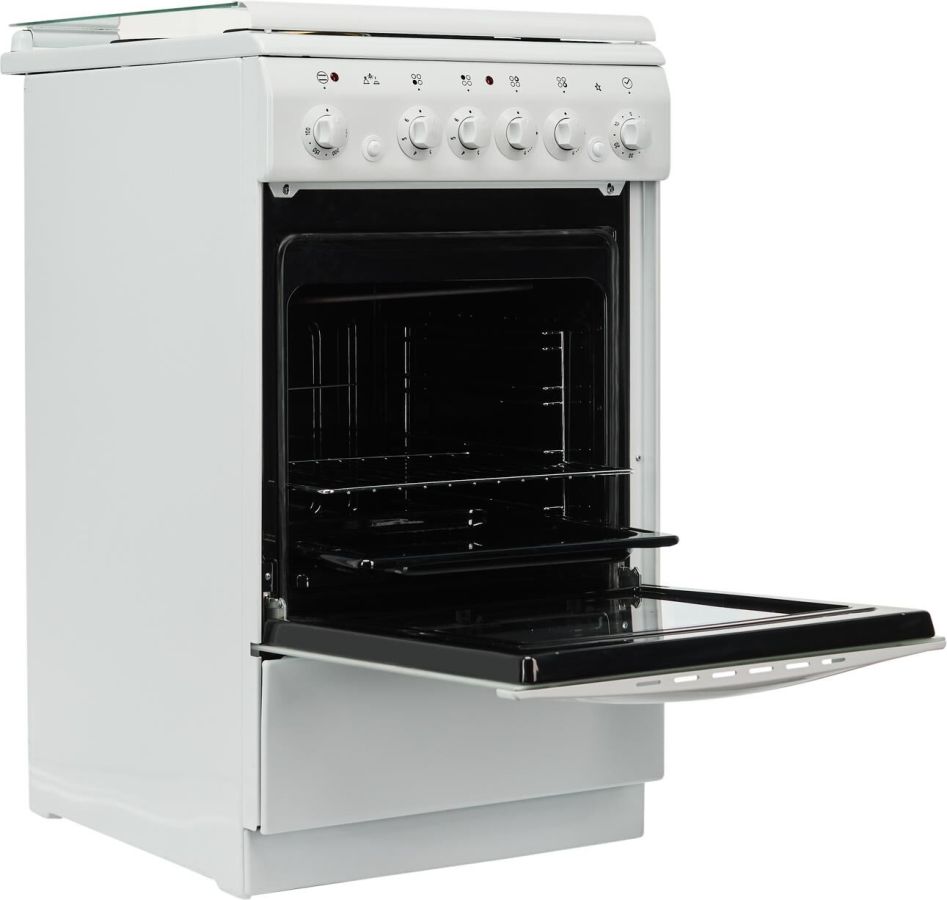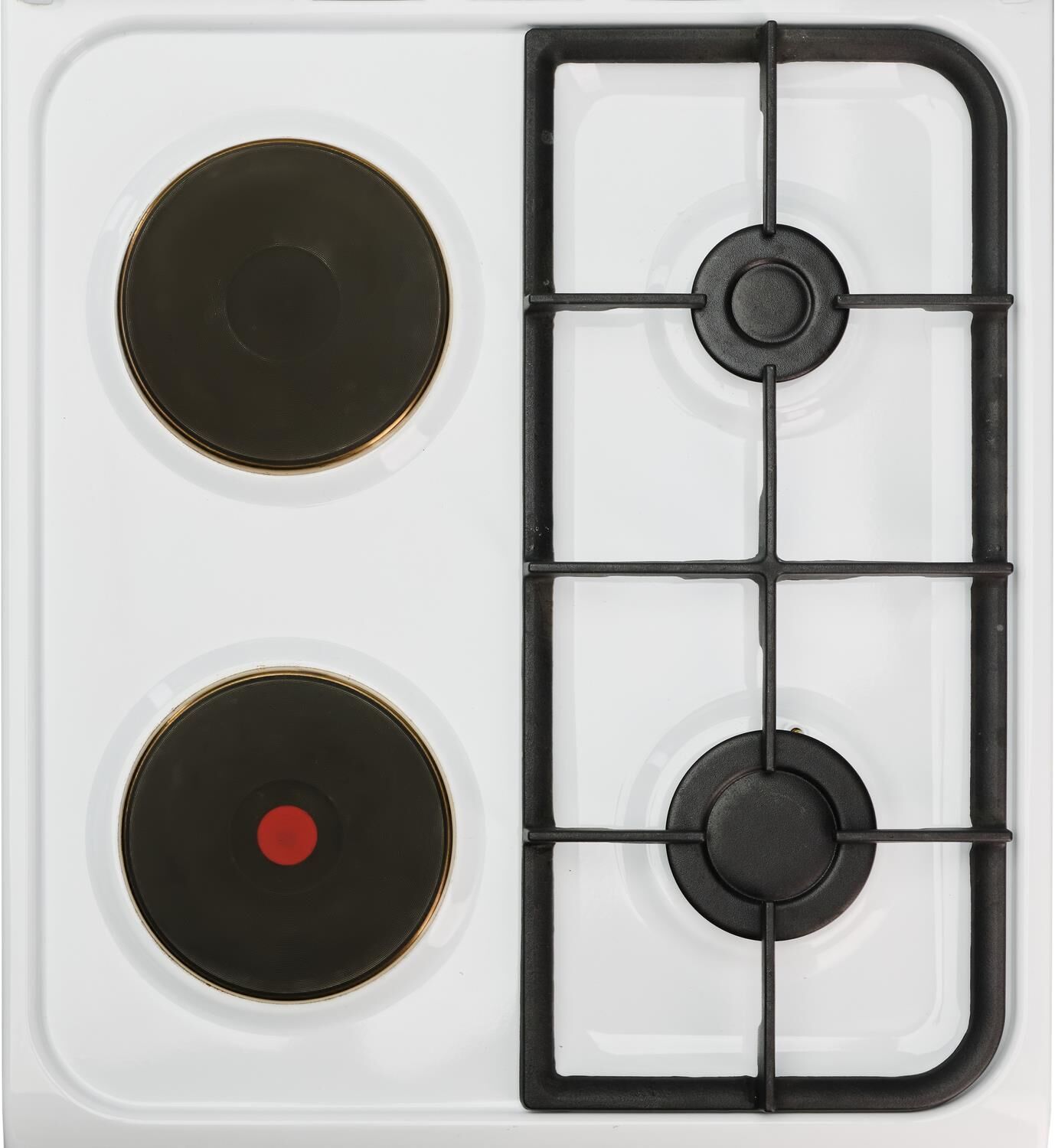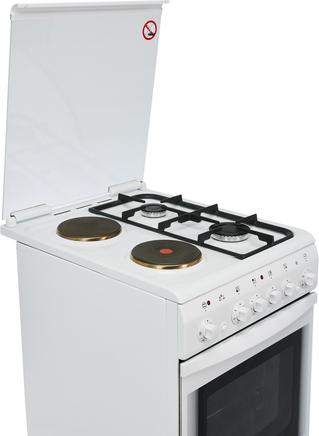 Тип: плита комбинированная; Цвет: белый; Варочная панель: Общее число конфорок: 4; Число электрических конфорок: 2; Число газовых конфорок: 2; Диаметр конфорок: 14.5 см; Материал конфорок: чугун; Газ-контроль конфорок; Материал покрытия поверхности: эмалированная сталь; Материал решеток: чугун; Крышка: стеклянная; Духовка: Тип духовки: электрическая; Объем духовки: 54 л; Режимы духовки: верхний нагрев + нижний нагрев; Термостат; Максимальная температура: 270 °C; Внутреннее покрытие: эмалированная сталь; Очистка духовки: традиционная; Подсветка духовки; Количество стекол дверцы духовки: 2; Вид управления: поворотный механизм; Звуковой сигнал; Таймер: механический; Тип таймера: звуковой; Электроподжиг варочной поверхности; Активация электроподжига: отдельная кнопка/рычаг; Наличие кабеля питания: кабель без вилки; Комплектация: противень х 2 шт, решетка; Мощность гриля: 1800 Вт