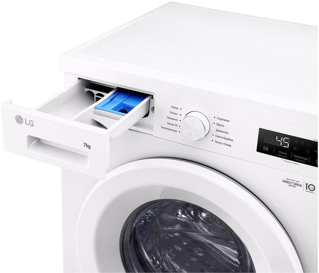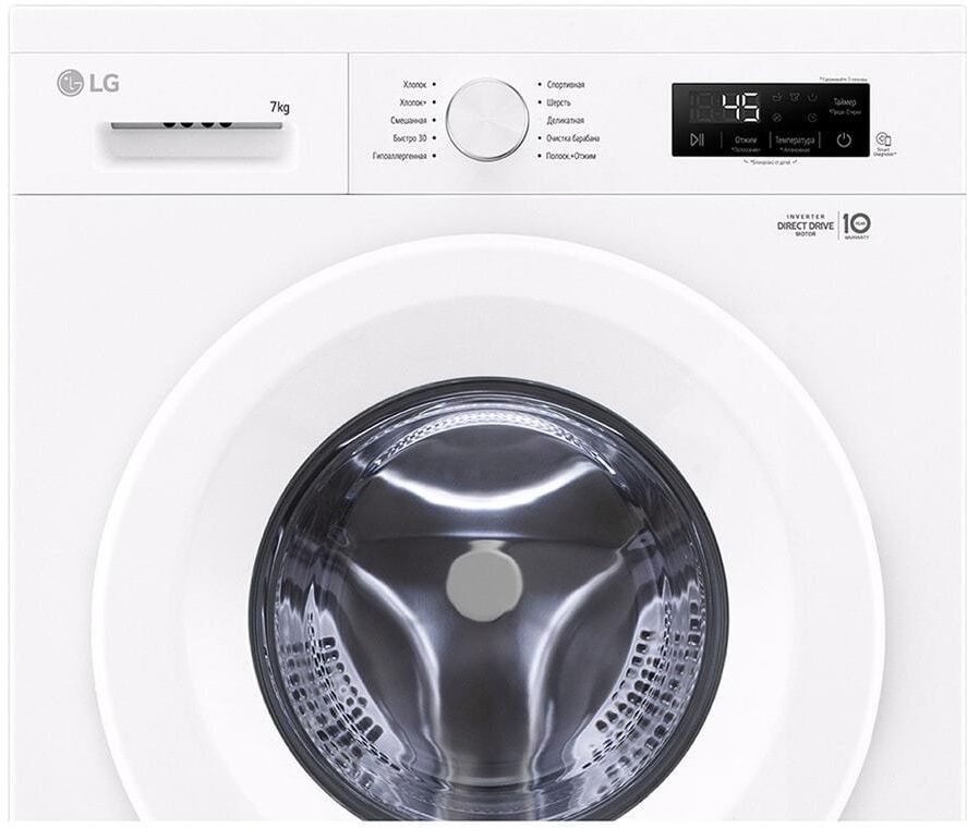 Габариты (ШxВxГ): 600 x 850 x 440. Максимальная скорость отжима: 1200. Загрузка: 7 кг. Цвет корпуса: Белый. Цвет панели: Белый. Цвет двери: Белый. Основные функции: Инверторный мотор с прямым приводом Inverter Direct Drive. Функция пара Steam. Функция очистки барабана. Уникальные программы: Гипоаллергенная, Быстро 30, Смешанная, Хлопок +, Деликатная, Спортивная, Очистка барабана