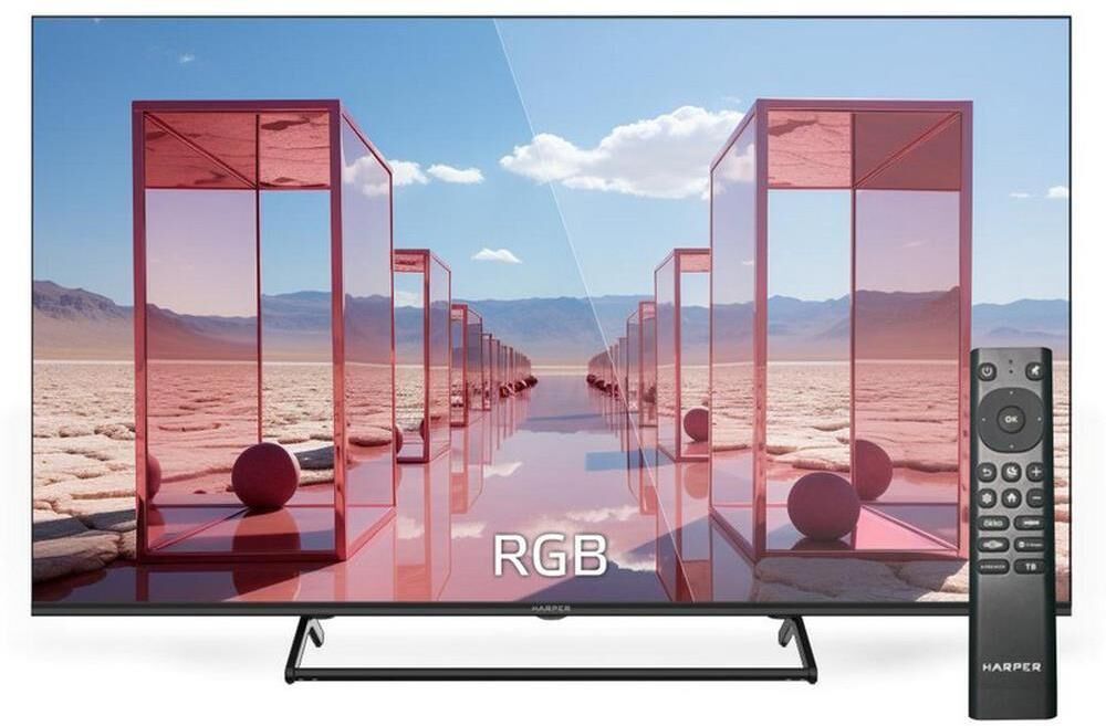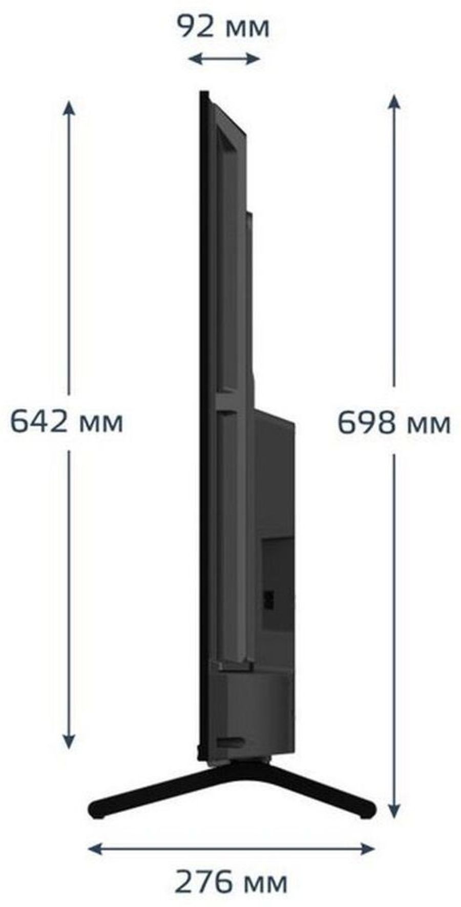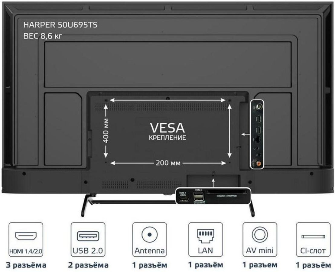 "Диагональ экрана 50"" (126 см) ULTRA HD (Android 11) Сбер/voice assistant, DDDR 1.5+8GB Bluetooth 5.1 Системы цветности аналогового ТВ: SECAM, PAL Системы цветности для AV: NTSC, PAL Цифровой тюнер DVB-T/Т2/C/S2 SMARTТV Wi-Fi Bluetooth Декодеры стереозвука NICAM, А2, АС3 Формат изображения: 16:9 Разрешение экрана 3840х2160 Контрасть 5000:1 Яркость 260 кд/м2 Угол обзора (гор/верт) 178°/178° Цифровой 3D фильтр Количество цветов 1,07 млрд. Время отклика 8 мс Меню на русском, английском языках Аудио 2 х 10 Вт Входы/выходы: Антенный вход Композитный AV вход 3 х HDMI 2 х USB CI слот LAN SPDIF Питание: Напряжение 100-240 В 50/60 Гц Макс. потребляемая мощность 130 Вт Потребляемая мощность в режиме ожидания - 0,5 Вт Удельная мощность рабочего режима: 0,018 Вт/кв.см Потребляемая мощность в выключенном режиме: О Вт Размеры с подставкой: 1111 х 698 х 261 мм Размеры без подставки: 1111 х 643 х 77 мм Вес: 8,5 кг VESA: 200 х 200 мм"