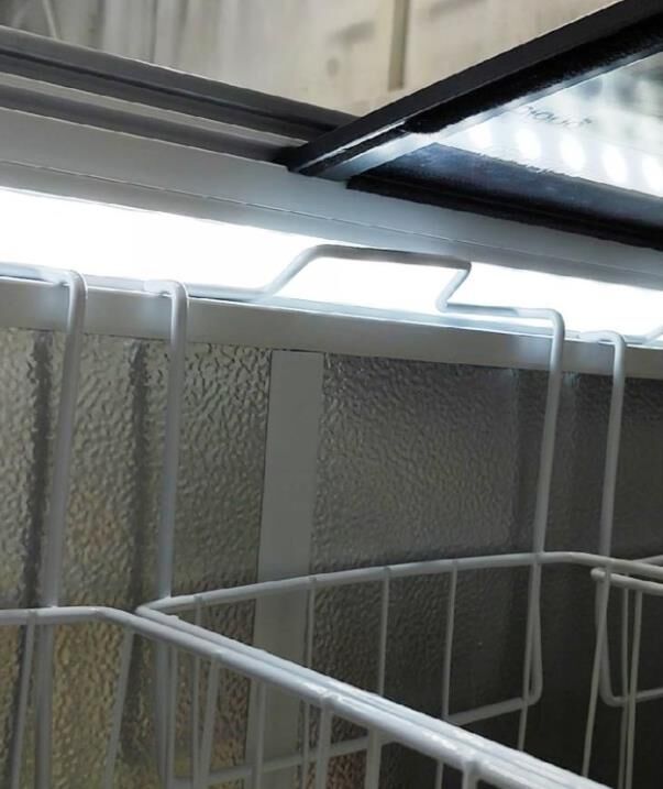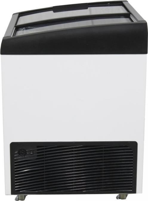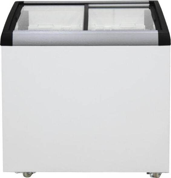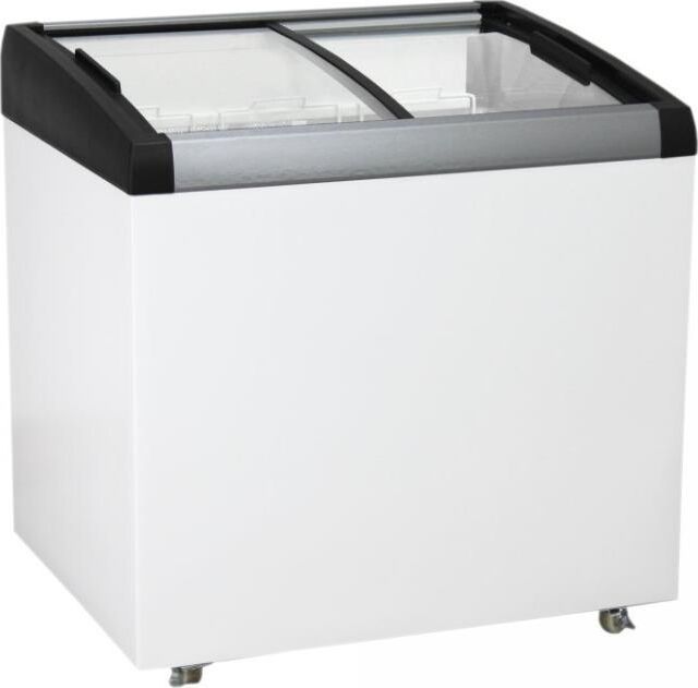 Морозильный ларь с гнутыми раздвижными стеклами; Цвет корпуса: Белый; Цвет короны: Серебристо-черный; Диапазон температуры: -18...-25°C; LED-подсветка внутреннего объема; Механическое управление; Корзины в комплекте; 4 колеса со стопором; Габариты: 88,5x85x66,5см; Объем: 230л; Работа при напряжении в сети 170-242В; Климатический класс: 5 (+40°С; 40%)