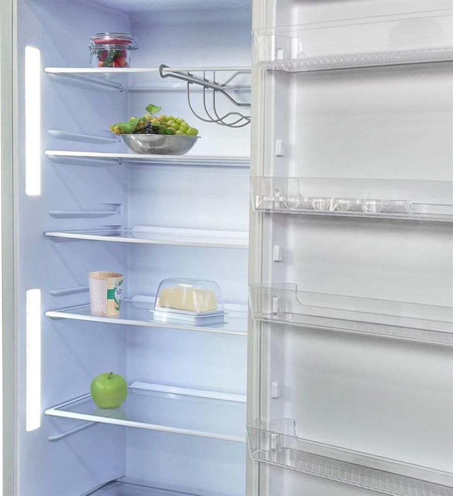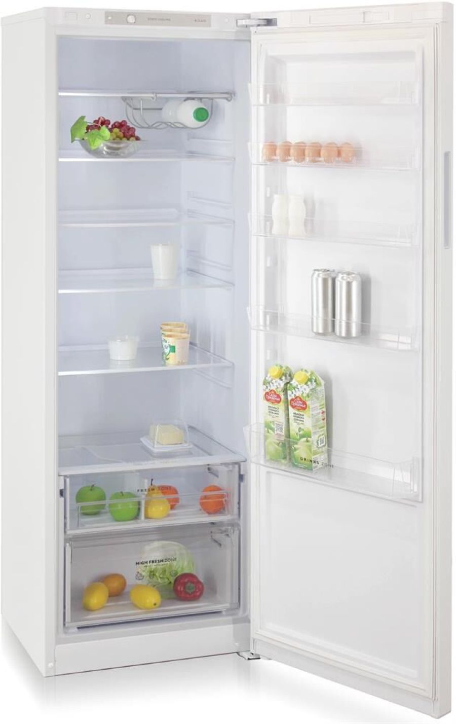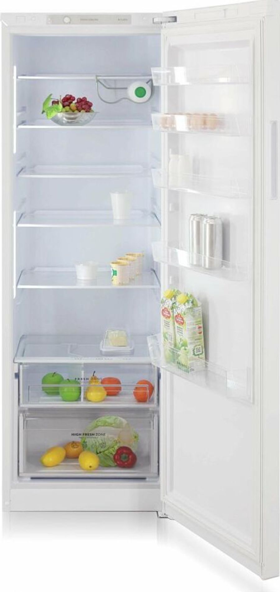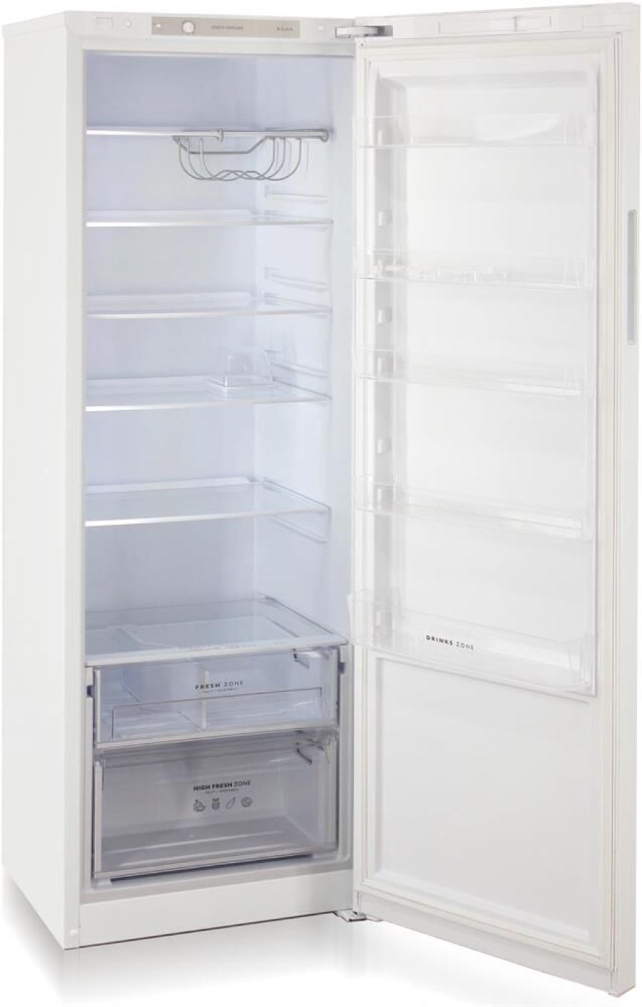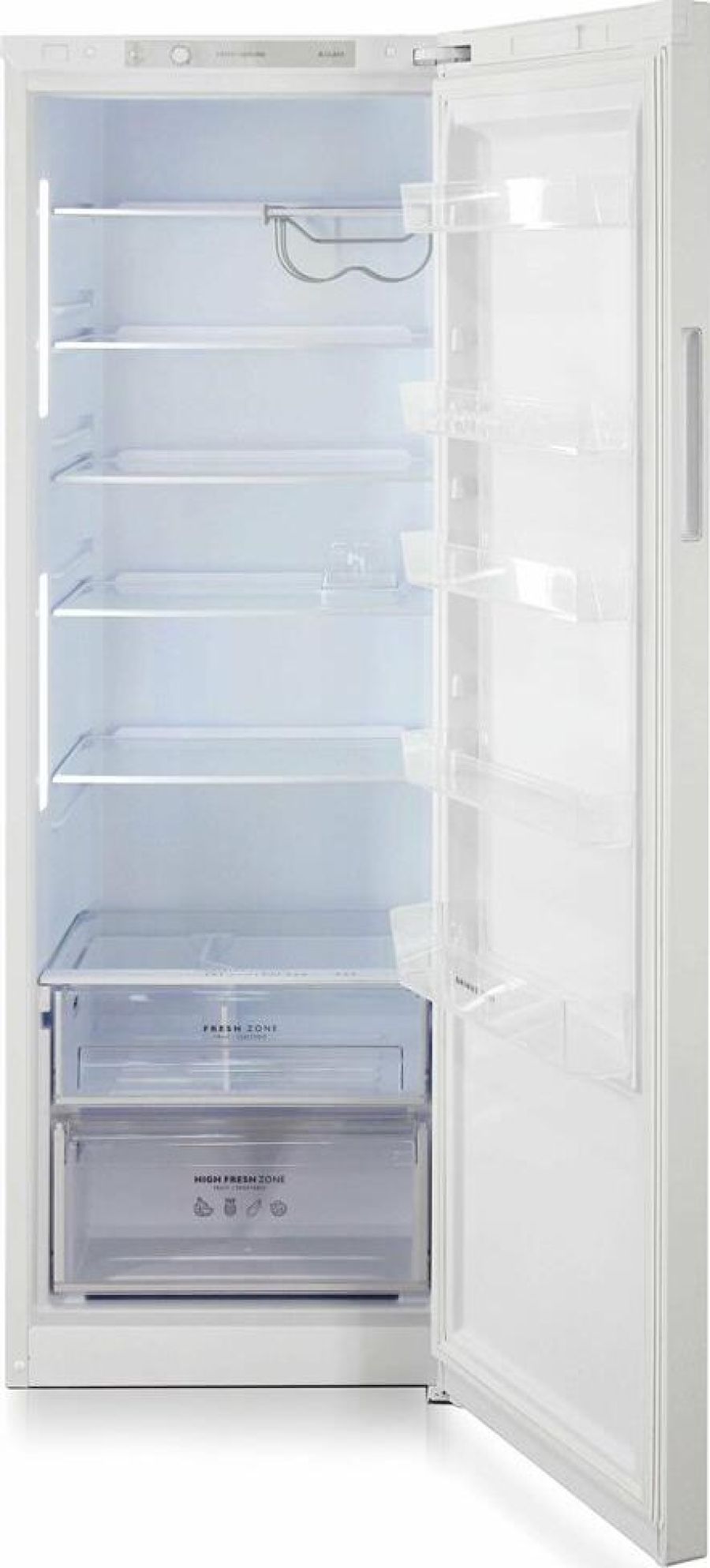 Однокамерный холодильник без морозильного отделения • цвет Белый • два вертикальных LED-светильника • регулировка влажности Humidity control • High fresh zone для больших продуктов • подвесная металлическая полка для бутылок • механическое управление • габариты 180x60x62,5см • объем 370л