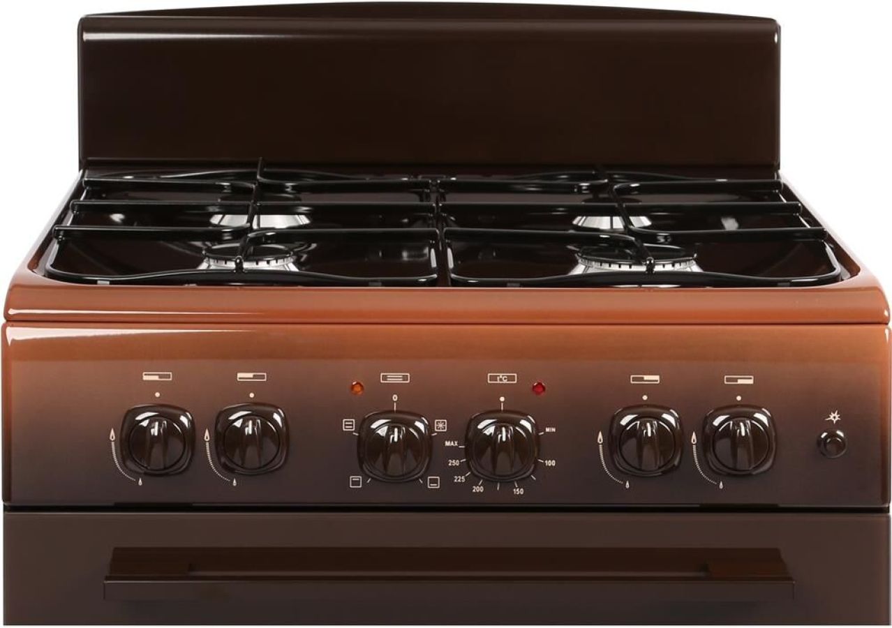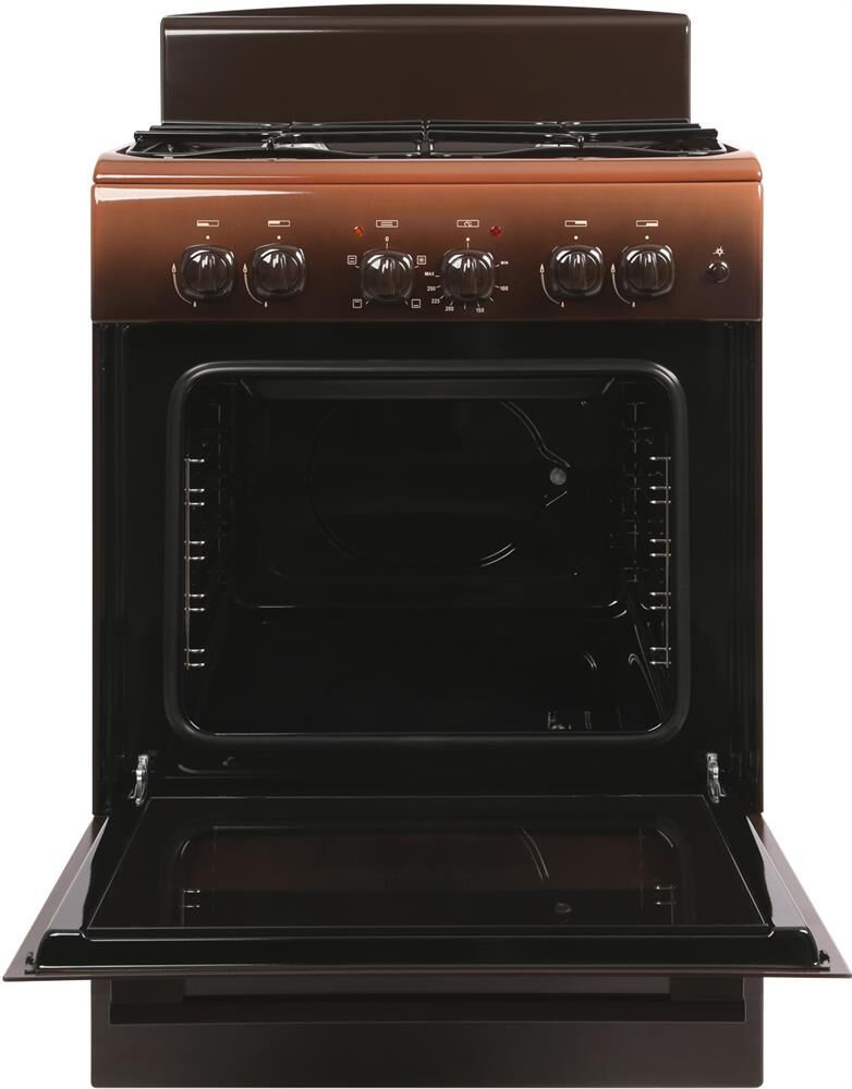 ЭКСКЛЮЗИВ ООО "ТД ОРИОН" * Габаритные размеры ШхГхВ: 60х60х85 см * Цвет: коричневый. Варочная поверхность: эмалированная * Объём духовки: 60 л * Духовка электрическая* Газ-контроль горелок стола * Терморегулятор (термостат) * Подсветка духовки одинарная * Электророзжиг горелок, кнопка розжига на панели * Съемные проволочные направляющие духовки *