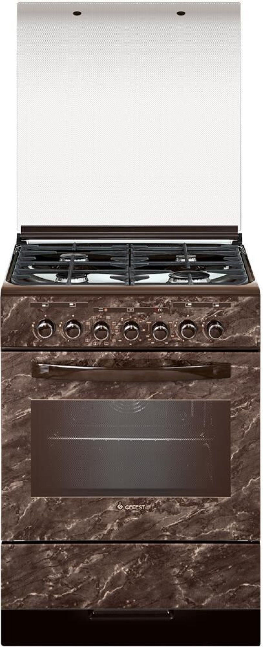 Габариты, ШхГхВ, см: 60x60x85;Цвет модели: Коричневый; Дизайн: Мрамор; Ширина, см: 60; Фасад: закаленное стекло; Варочная поверхность: эмалированная; Решетки стола: чугунные; Крышка стола: стеклянная; Класс энергоэффективности: A; Номинальная потребляемая мощность электроэнергии, кВт 2,99-3,25; Тип духовки: электрическая; Мощность верхнего ТЭН духовки, кВт: 0,8; Мощность нижнего ТЭН духовки, кВт: 1,2Мощность ТЭН вентилятора, кВт: 2,0; ТЭН-гриль: 1,2; Объем духовки, л: 55; Таймер: электромеханический; Газ-контроль горелок стола; Электророзжиг горелок стола: встроен в ручки; Гриль: электрический; Вертел с электроприводом; Конвекция; Подсветка духовки: одинарная; Направляющие духовки: съемные проволочные; Терморегулятор (термостат); Ящик для посуды и принадлежностей: выдвижной ящик; Ножки регулировочные; Сетевой шнур и вилка: в наличии; Комплектность: жаровня, комплект сменных сопел, противень, решетка духовки