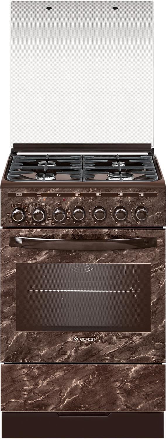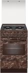 Габаритные размеры ШхГхВ: 50х58.5х85 см * Цвет: коричневый с рисунком "мрамор". Варочная поверхность: эмалированная * Объём духовки: 55 л. Духовка: электрическая * Вертел с электроприводом * Съемные проволочные направляющие духовки * Выдвижной ящик для посуды и принадлежностей * Таймер электромеханический * Газ-контроль горелок стола * Терморегулятор (термостат) * Гриль электрическийУсиленный гриль с конвекцией * Ножки регулировочные * Чугунные решетки горелок стола * Подсветка духовки одинарная * Электророзжиг горелок, встроенный в ручки *