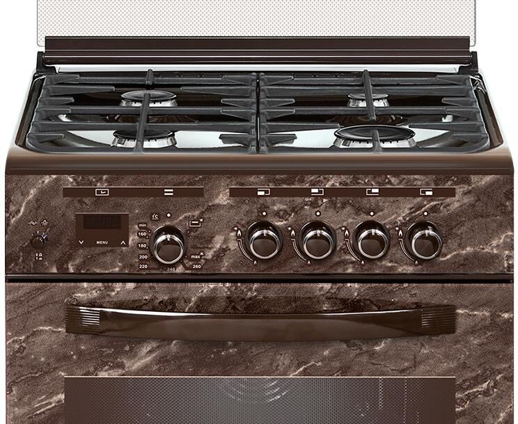 Габариты, ШхГхВ, см: 60x60x85; Цвет: с рисунком "мрамор", коричневый; Дизайн: мрамор; Ширина, см: 60; Фасад: закаленное стекло; Варочная поверхность: эмалированная; Решетки стола: чугунные; Крышка стола: стеклянная; Класс электробезопасности: I; Объем духовки, л: 52; Мощность горелки духовки, кВт: 3,1; Мощность гриль-горелки, кВт: 1,9; Таймер: сенсорный; Газ-контроль духовки; Газ-контроль горелок стола; Электророзжиг духовки: встроен в ручку; Электророзжиг горелок стола: встроен в ручки; Гриль: газовый; Вертел с электроприводом; Подсветка духовки; Направляющие духовки: съемные проволочные; Терморегулятор (термостат); Ящик для посуды и принадлежностей: выдвижной; Ножки регулировочные; Сетевой шнур и вилка: в наличии; Стекло дверцы духовки: двойное; Комплектность: жаровня, противень, решетка духовки; Комплект сменных сопел
