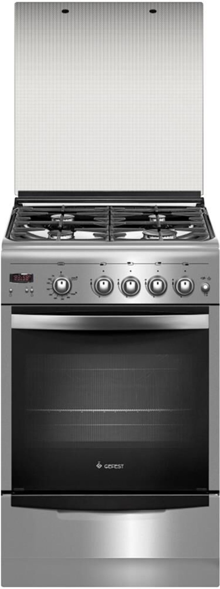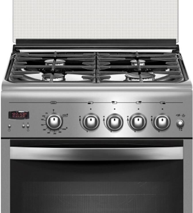 Габариты, ШхГхВ, см: 50x58.5x85; Цвет: нержавеющая сталь; Дизайн: классик; Ширина, см: 50; Фасад: нержавеющая сталь; Варочная поверхность: нержавеющая сталь; Решетки стола: чугунные; Крышка стола: стеклянная; Класс электробезопасности: I; Таймер: электронный; Газ-контроль духовки; Объем духовки, л: 52; Газ-контроль горелок стола; Электророзжиг духовки: встроен в ручку; Электророзжиг горелок стола: встроен в ручки; Гриль газовый; Вертел с электроприводом; Подсветка духовки; Направляющие духовки: съемные проволочные; Терморегулятор (термостат); Ящик для посуды и принадлежностей: выдвижной; Ножки регулировочные; Сетевой шнур и вилка: в наличии; Стекло дверцы духовки: двойное; Мощность горелки духовки, кВт: 3,1; Мощность гриль-горелки, кВт: 1,9; Комплектность: жаровня, накладка для посуды малого диаметра, противень, решетка духовки; Комплект сменных сопел