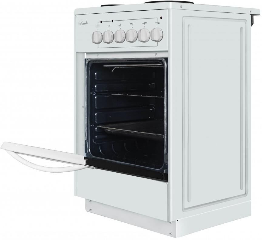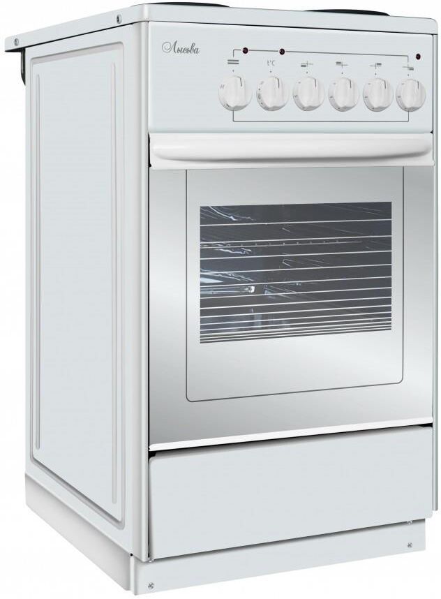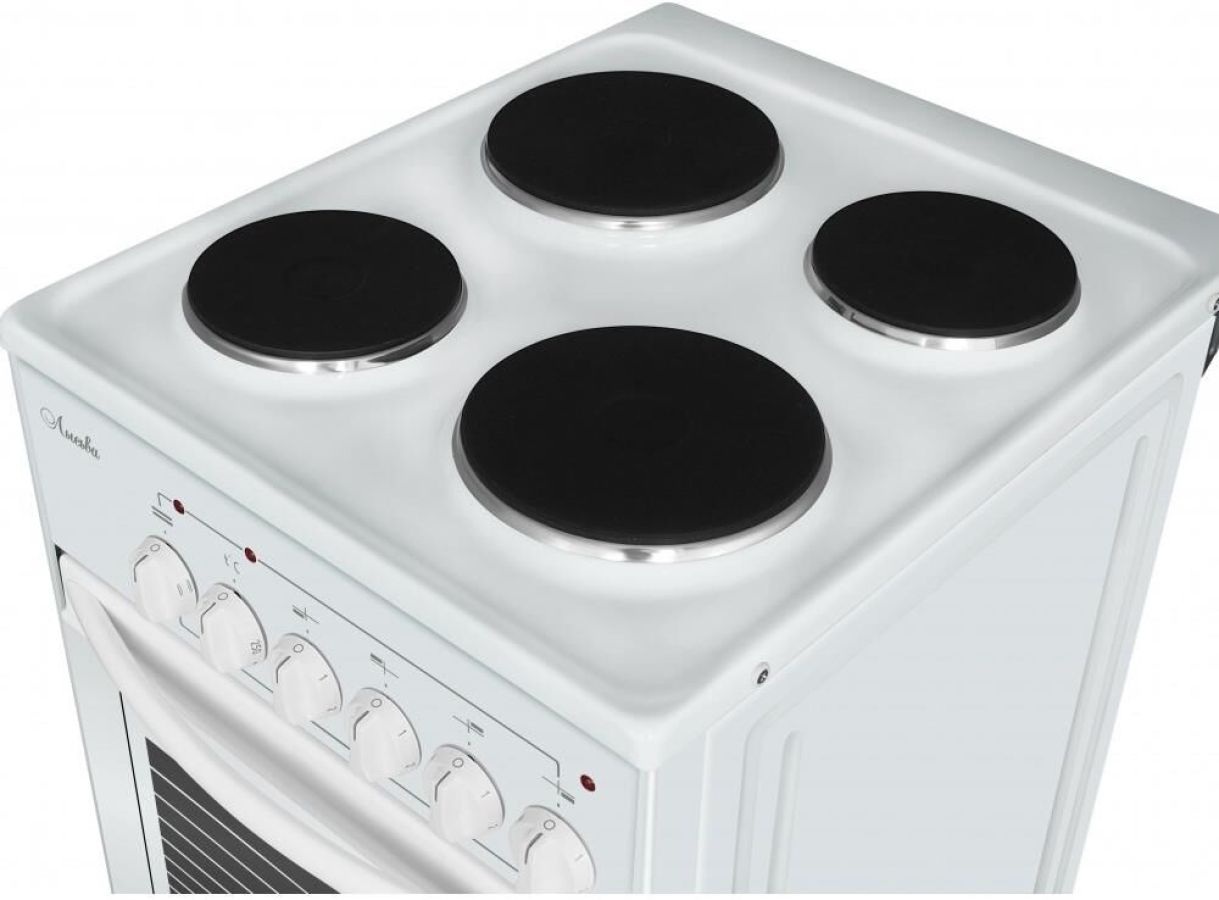 (ШхГхВ)50х60х84см.Цвет белый.Количество конфорок 4.Мощность конфорок, кВт (передняя левая) 1.Мощность конфорок, кВт (задняя правая)1.Мощность конфорок, кВт (передняя правая)1.5.Мощность конфорок, кВт (задняя левая)1.5.Объём духовки, л57.Дверца с двойным стеклом.Противень.Решетка.Металлический фасад ящика.Мощность установленная (потребляемая), кВт7,0 (5,5).Масса нетто 31 кг.