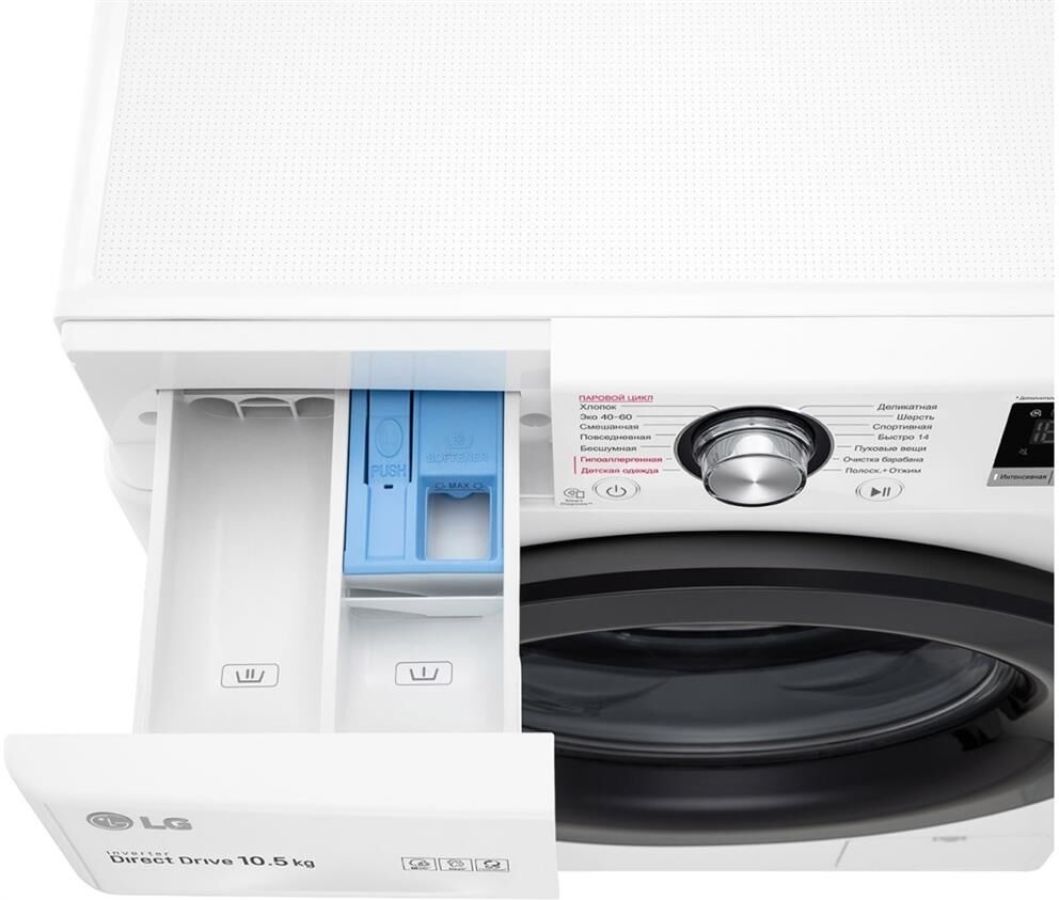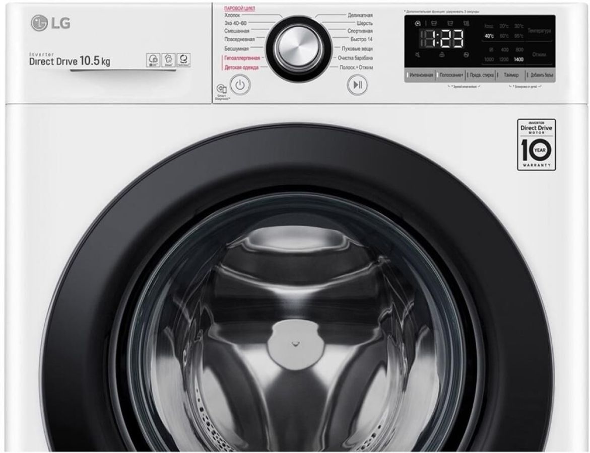 РАЗМЕРЫ (Ш х В х Г, ММ) 600 x 850 x 565 * ЗАГРУЗКА Стирка: 10.5 кг * Цвет белый, Цвет дверцы черный * Максимальная скорость отжима (об/мин) 1400 * Инверторный мотор с прямым приводом * Тип барабана Пузырьковый * ФУНКЦИЯ ПАРА * Управление Сенсорное * Детектор загрузки * Интеллектуальная система стирки AI DD * Диапазон температуры стирки ( ) Холодная/20/30/40/60/95 * Угол открытия дверцы 150° * Мобильная диагностика Smart Diagnosis *