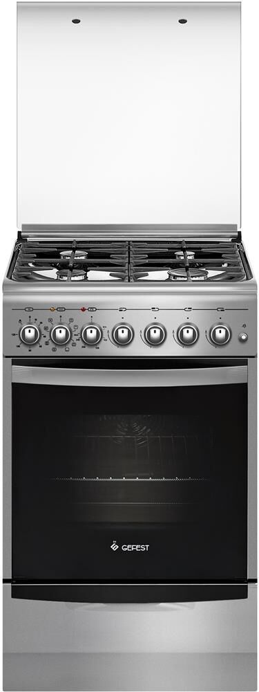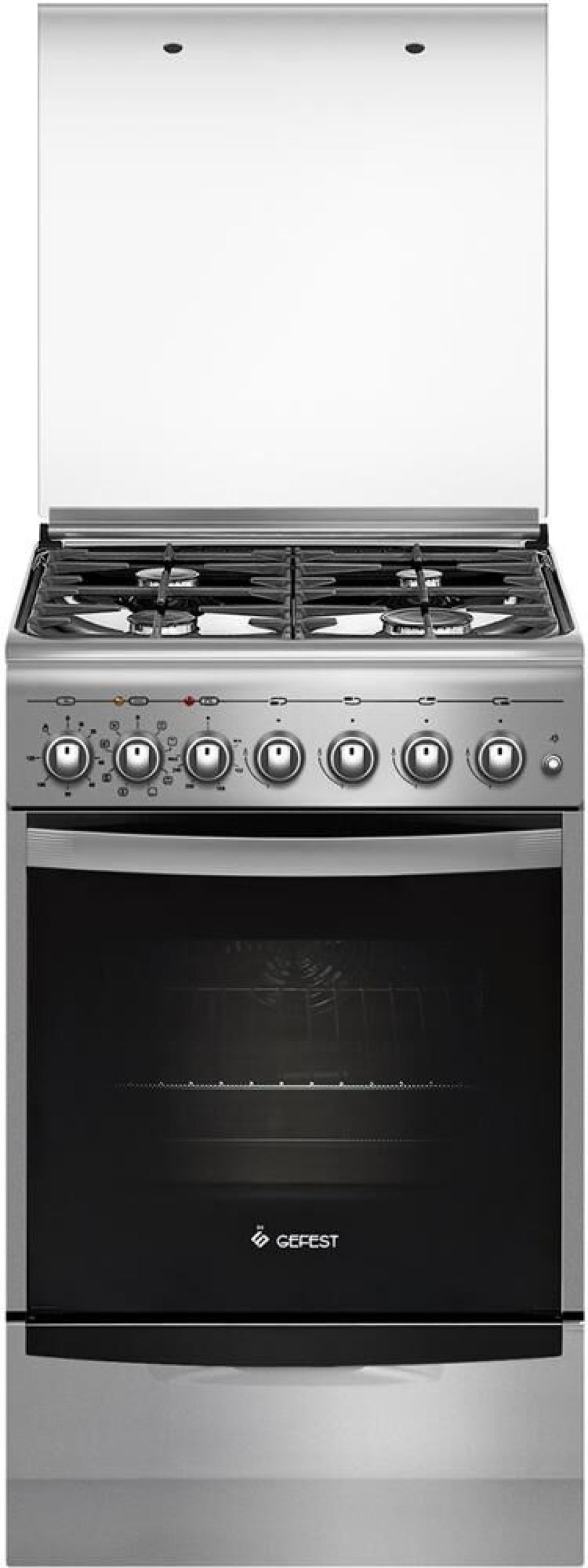 Габариты, ШхГхВ, см: 50x58.5x85; Цвет: нержавеющая сталь; Дизайн: классический; Фасад: нержавеющая сталь; Варочная поверхность: нержавеющая сталь; Ширина, см: 50; Решетки стола: чугунные; Крышка стола: стеклянная; Присоединительная резьба газопровода: G 1/2; Класс энергоэффективности: A; Номинальная потребляемая мощность электроэнергии, кВт: 2,97-3,25; Тип духовки: электрическая; Мощность верхнего ТЭН духовки, кВт: 0,8; Мощность нижнего ТЭН духовки, кВт: 1,2; Мощность ТЭН вентилятора, кВт: 2,0; ТЭН-гриль: 1,2; Объем духовки, л: 55; Таймер: электромеханический; Электророзжиг горелок стола: кнопка на панели; Гриль: электрический; Вертел с электроприводом; Конвекция; Подсветка духовки: одинарная; Направляющие духовки: съемные проволочные; Террморегулятор (термостат); Ящик для посуды и принадлежностей: выдвижной ящик; Ножки: регулировочные; Сетевой шнур и вилка: в наличии