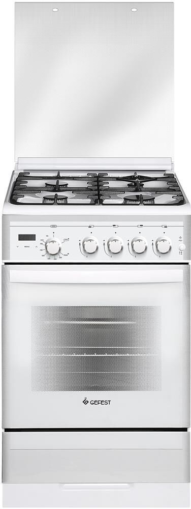 Габаритные размеры ШхГхВ, см: 50x58.5x85. Цвет: белый. Объем духовки, л: 52. Фасад: стеклянный. Количество зон приготовления: 4. Варочная поверхность: эмалированная. Крышка: стеклянная крышка. Класс электробезопасности: I. Вертел с электроприводом. Съемные проволочные направляющие духовки. Выдвижной ящик для посуды и принадлежностей. Таймер сенсорный. Газ-контроль горелок стола. Терморегулятор (термостат). Газ-контроль духовки. Гриль. Электророзжиг горелок, встроенный в ручки. Ножки регулировочные. Электророзжиг духовки, встроенный в ручку. Подсветка духовки одинарная