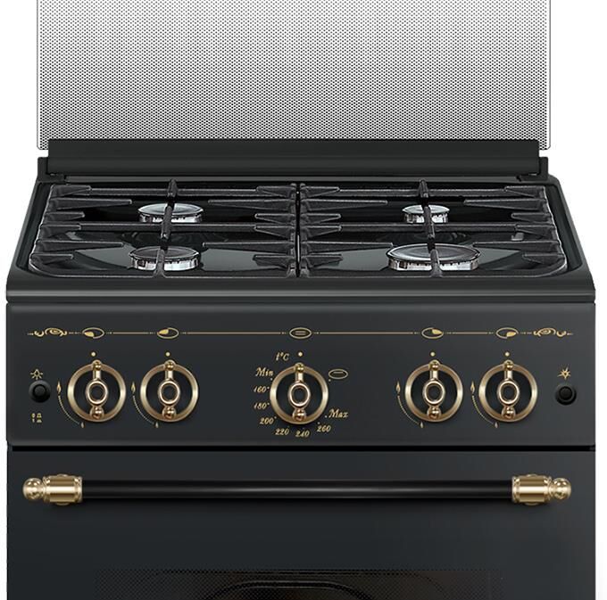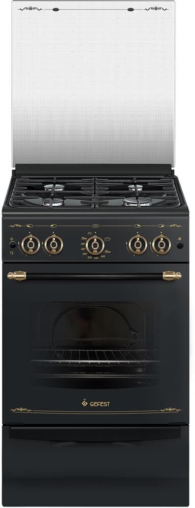 Габариты ШхГхВ: 50х58.5х85см; Ширина, см: 50; Цвет: с рисунком "ретро", черный; Дизайн: ретро; Полезный объём духовки: 52л; Фасад: эмалированный; Варочная поверхность: эмалированная; Решетки стола: чугунные; Крышка стола: стеклянная; Класс электробезопасности: I; Вертел с электроприводом; Съемные проволочные направляющие духовки; Выдвижной ящик для посуды и принадлежностей; Таймер механический; Газ-контроль духовки; Терморегулятор (термостат); Гриль; Ножки регулировочные; Электророзжиг горелок: кнопка розжига на панели; Подсветка духовки одинарная; Электророзжиг духовки: кнопка розжига на панели