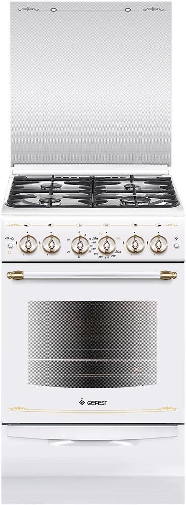 Габариты ШхГхВ: 50х58.5х85см; Ширина, см: 50; Цвет: белый, с рисунком "ретро"; Объем духовки, л: 52; Мощность горелки духовки, кВт: 3,1; Мощность гриль-горелки, кВт: 1,9; Варочная поверхность: эмалированная; Решетки стола чугунные; Крышка стола: стеклянная; Класс электробезопасности: I; Таймер механический; Газ-контроль духовки; Электророзжиг духовки: кнопка на панели; Электророзжиг горелок стола: кнопка на панели; Гриль: газовый; Вертел с электроприводом; ; Подсветка духовки; Направляющие духовки: съемные проволочные; Терморегулятор (термостат); Ящик для посуды и принадлежностей: выдвижной; Ножки регулировочные; Сетевой шнур и вилка: в наличии; Стекло дверцы духовки: двойное; Комплектность жаровня, накладка для посуды малого диаметра, противень, решетка духовки; Комплект сменных сопел