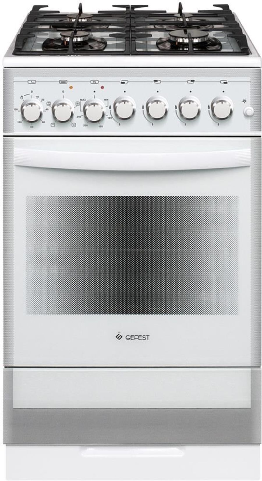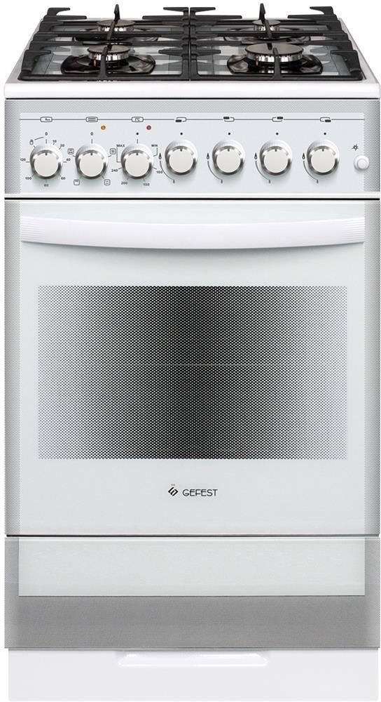 Габариты, ШхГхВ, см: 50x58.5x85; Цвет: белый; Дизайн: классический; Ширина, см: 50; Фасад: закаленное стекло; Варочная поверхность: закаленное стекло; Решетки стола: чугунные; Присоединительная резьба газопровода: G 1/2; Класс энергоэффективности: A; Номинальная потребляемая мощность электроэнергии, кВт: 1,84-2,02; Тип духовки: электрическая; Мощность верхнего ТЭН духовки, кВт: 0,8; Мощность нижнего ТЭН духовки, кВт: 1,2; Объем духовки, л: 55; Таймер: электромеханический; Электророзжиг горелок стола: кнопка на панели; Гриль: электрический; Вертел с электроприводом; Подсветка духовки: одинарная; Направляющие духовки: съемные проволочные; Терморегулятор (термостат); Ящик для посуды и принадлежностей: выдвижной ящик; Ножки регулировочные; Сетевой шнур и вилка: в наличии; Комплектность: жаровня, накладка для посуды малого диаметра, комплект сменных сопел, решетка духовки