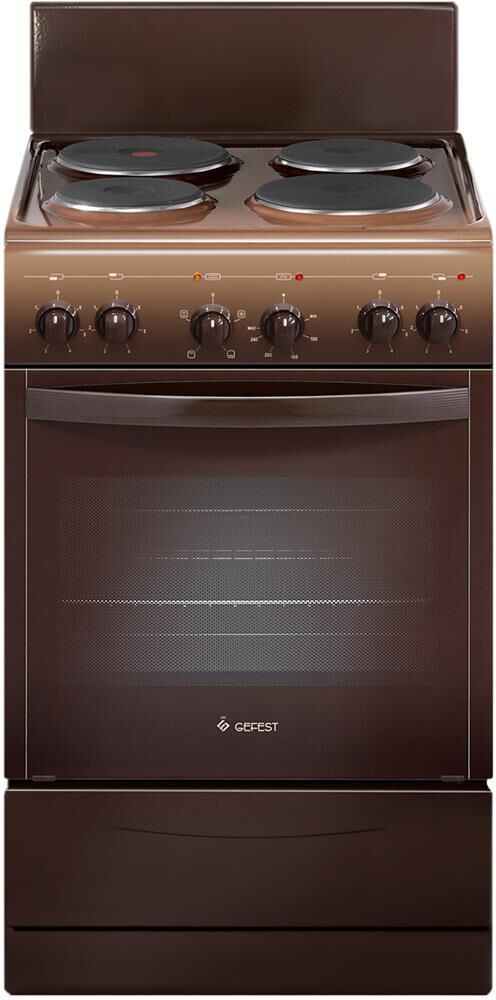 Габариты, ШхГхВ, см: 50x58.5x85; Цвет: коричневый; Дизайн: классический; Ширина, см: 50; Фасад: эмалированный; Варочная поверхность: эмалированная; Крышка стола: щиток; Количество зон приготовления: 4; Класс энергоэффективности: А; Диапазон номинальных напряжений, В: 220-230; Номинальная потребляемая мощность электроэнергии, кВт: 5,05-5,52; Объем духовки, л: 55; Мощность нижнего ТЭН духовки, кВт: 1,2; Управление: механическое; Подсветка духовки: одинарная; Направляющие духовки: штампованные; Терморегулятор; Ящик для посуды и принадлежностей: откидная крышка; Ножки регулировочные; Сетевой шнур и вилка: в наличии; Комплектность: решетка духовки, жаровня 2 шт