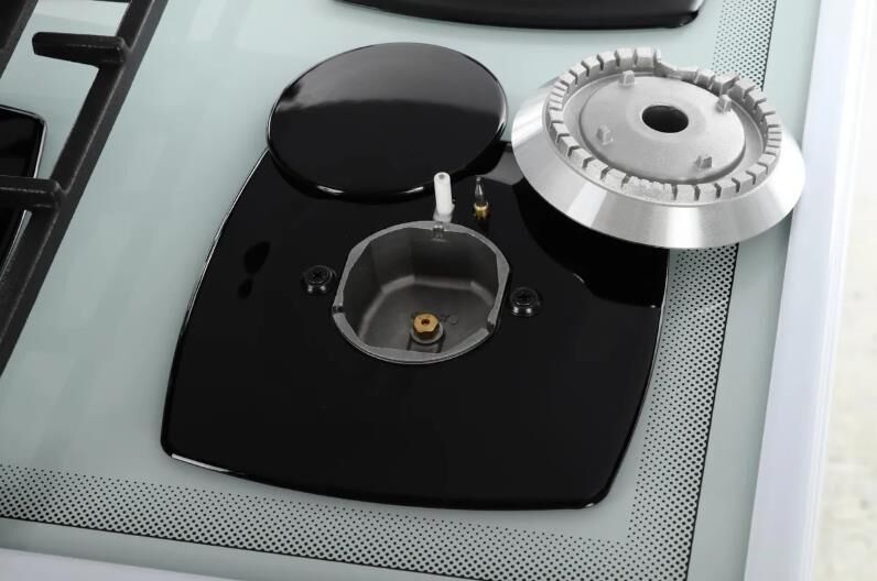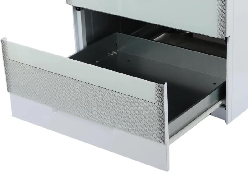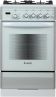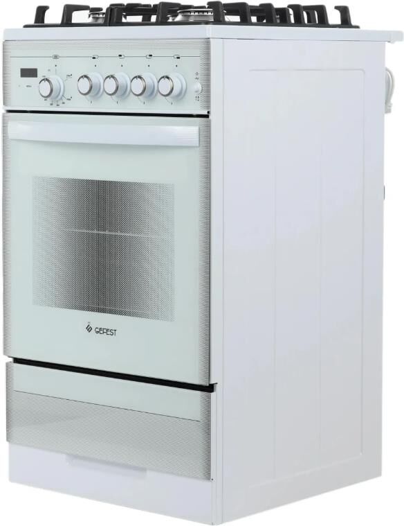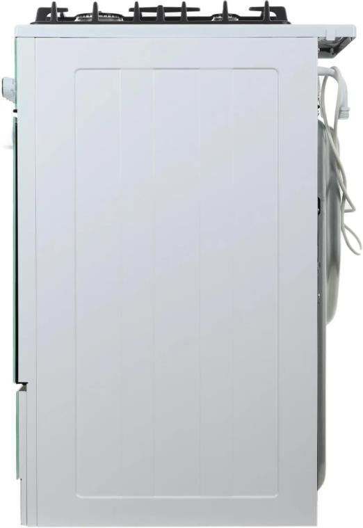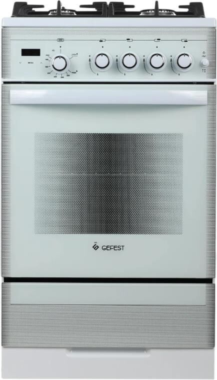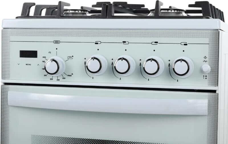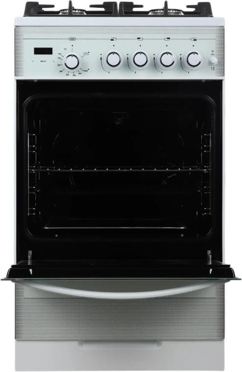Габариты 50х58,5х85см. 4 газ. горелки. Газ-контроль горелок стола. Встроенный в ручки управл-я электророзжиг горелок стола. Таймер электрон. Духовка 52л. Вертел с электроприводом. Гриль-горелка. Термостат. Белая, Стол из жаропроч. стекла.