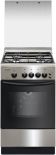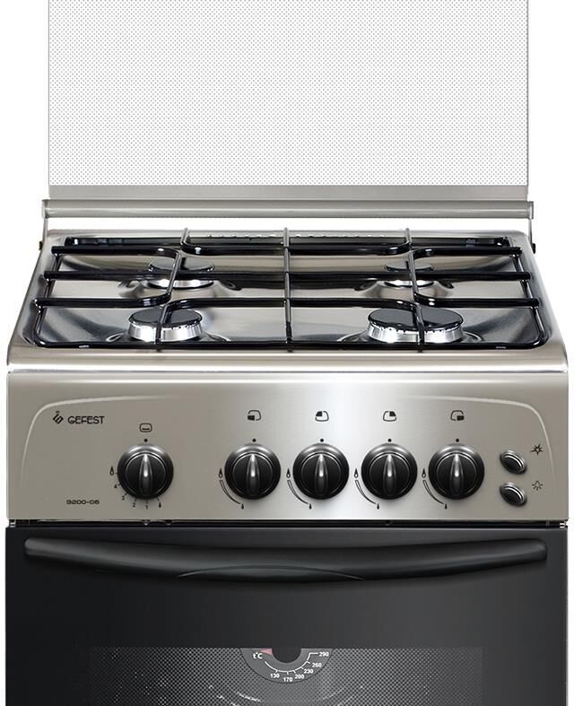Габариты: 50х57х85см; Газовые горелки: 4; Объем духовки: 44л; Электророзжиг горелок стола, кнопка на панели; Газ-контроль духовки; Подсветка духовки: одинарная; Термоуказатель духовки; Штампованные направляющие духовки; Фасад из нержавеющей стали. Стеклянная крышка
