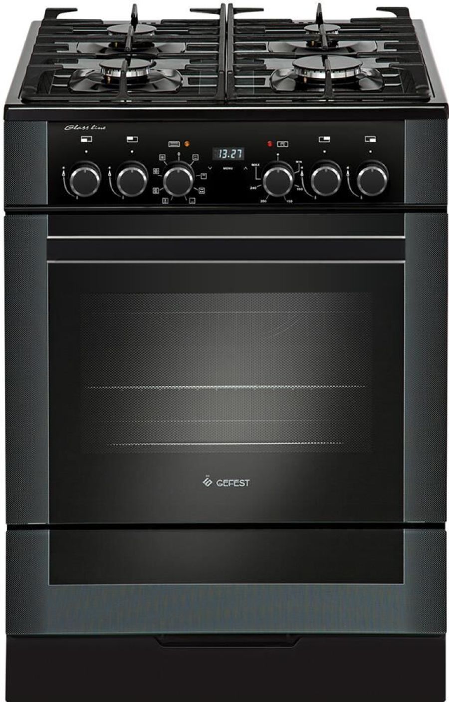 Габариты, ШхГхВ, см: 60x60x85; Цвет: черный; Дизайн: классический; Ширина, см: 60; Фасад: закаленное стекло; Варочная поверхность: закаленное стекло; Решетки стола: чугунные; Присоединительная резьба газопровода: G 1/2; Класс энергоэффективности: A; Номинальная потребляемая мощность электроэнергии, кВт: 3,0-3,28; Тип духовки: лектрическая; Мощность верхнего ТЭН духовки, кВт: 0,8; Мощность нижнего ТЭН духовки, кВт: 1,2; Мощность ТЭН вентилятора, кВт: 2,0; ТЭН-гриль: 1,2; Объем духовки, л: 55; Таймер: сенсорный; Газ-контроль горелок стола; Электророзжиг горелок стола: встроен в ручки; Гриль: электрический; Вертел с электроприводом; Шашлычница; Конвекция; Подсветка духовки: двойная; Направляющие духовки: съемные проволочные; Терморегулятор (термостат); Ящик для посуды и принадлежностей: выдвижной ящик; Ножки регулировочные; Сетевой шнур и вилка: в наличии; Комплектность: жаровня, накладка для посуды малого диаметра, комплект сменных сопел, решетка духовки