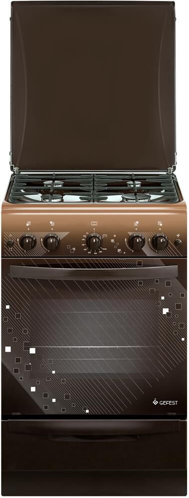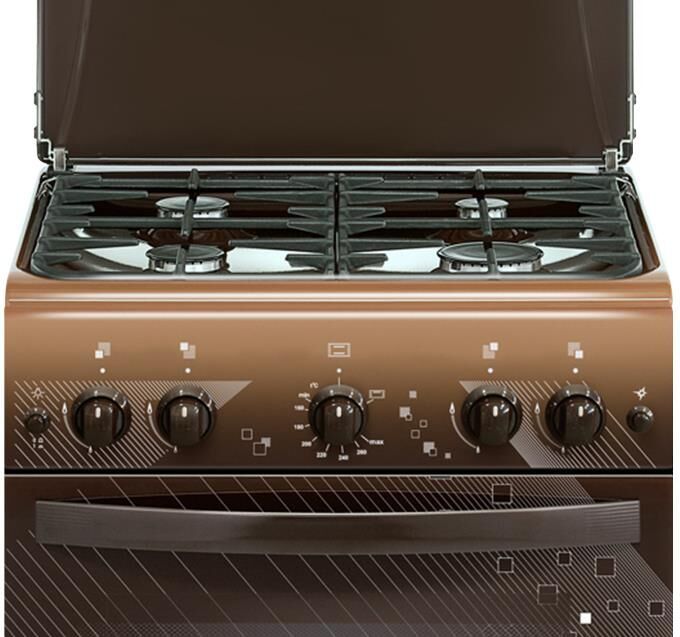 Габариты: 50х58.5х85см. 4 газ. горелки. Духовка газовая. Полезный объем духовки 52л. Газ-контроль духовки. Электророзжиг горелок стола/духовки. Терморегулятор. Гриль-горелка. Проволочные направляющие духовки. Цвет коричневый.