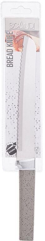 Нож для хлеба Длина лезвия: 20 см Толщина стали: 1,5 мм Пластиковая рукоятка с покрытием soft-touch (ТПР) под мрамор, матовая полировка лезвия. Материал: нержавеющая сталь (2CR14), полипропилен, ТПР.