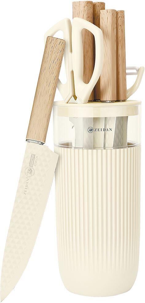 Набор ножей 8 предметов. Лезвие ножей из высококачественной нержавеющей стали : (нож поварской - 1,5mm/8", нож для хлеба - 1,5mm/8", нож разделочный -1,5mm/8", нож универсальный - 1,2mm/5", нож для овощей – 1,2mm/3,5", ножницы, овощечистка, прорезиненны
