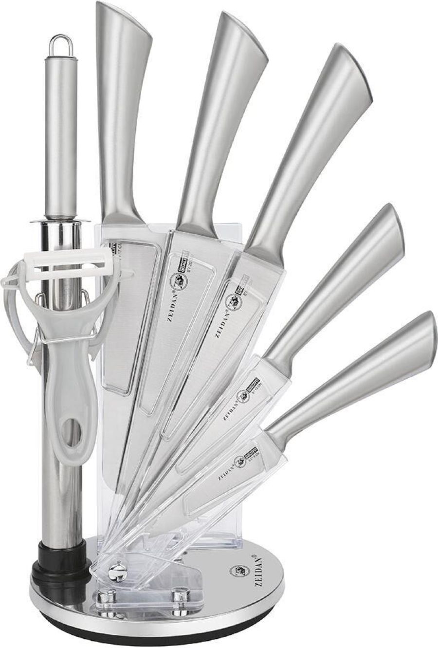 Набор ножей, 9 ПРЕДМЕТОВ, (поварской нож-2,5mm/8", нож разделочный-2,5mm/8", нож-топорик-2,5/6,5", универсальный нож -2,0mm/5", нож для овощей – 2,0mm/3,5", мусат, ножницы, овощечистка с керамическим лезвием) РУЧКИ - НЕРЖАВЕЮЩАЯ СТАЛЬ, СКЛАДНАЯ ПОДСТАВКА