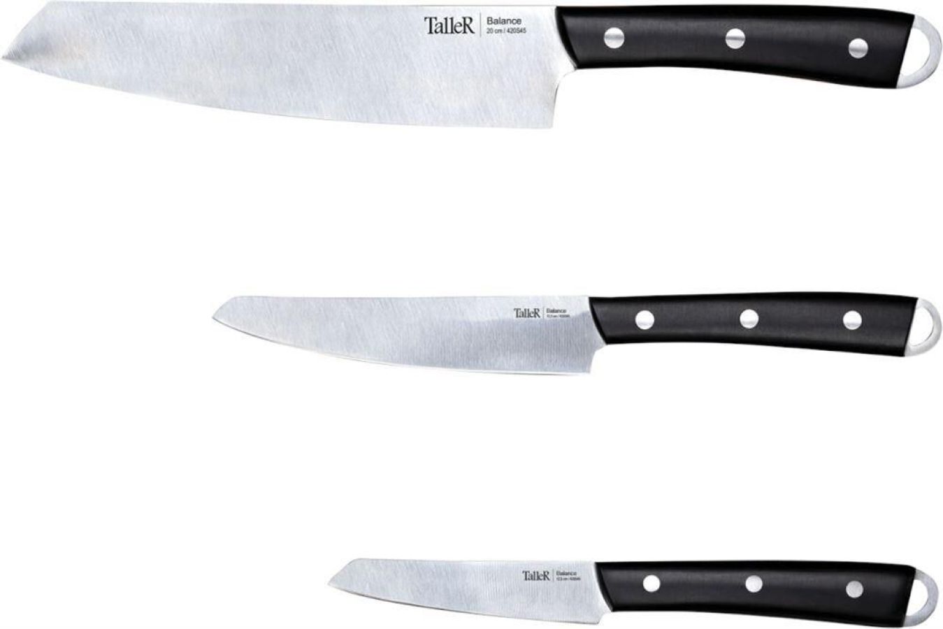 Набор ножей Balance, 3 пр. Материал - нержавеющая сталь, ручки из пластика Состав:нож поварской – 1 шт, 20см; нож универсальный – 1 шт, 12,5см; нож для чистки – 1 шт, 9 см Рекомендуется ручная мойка Упаковка - коробка