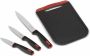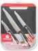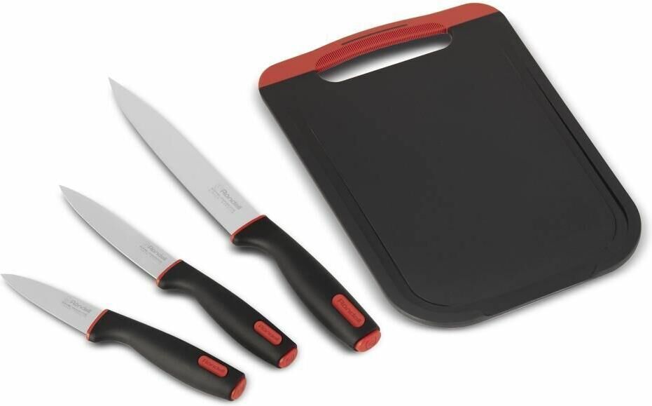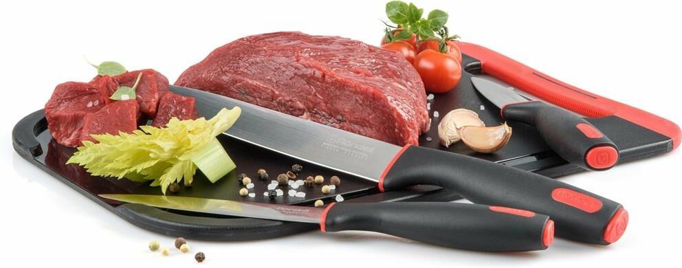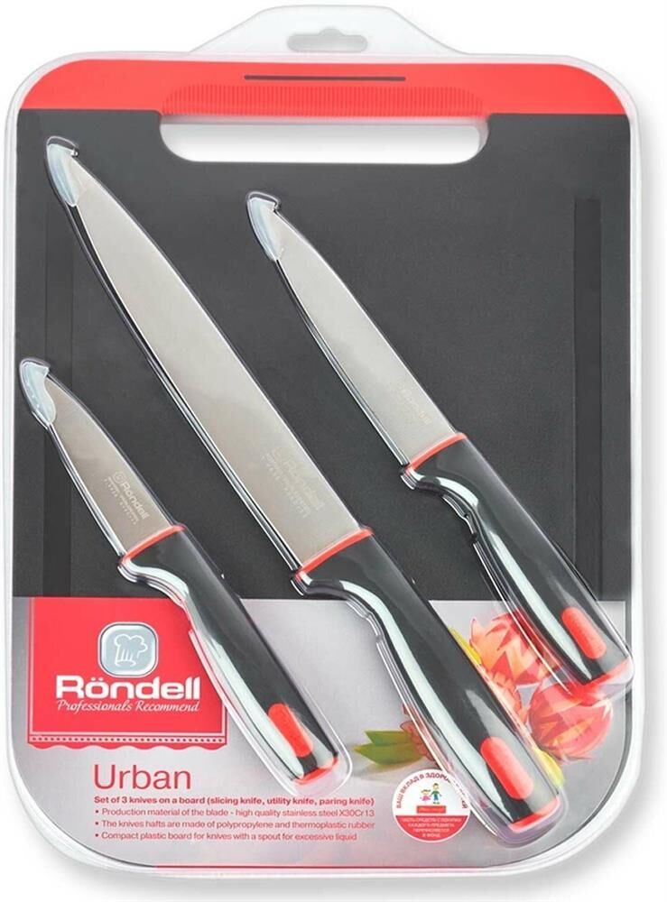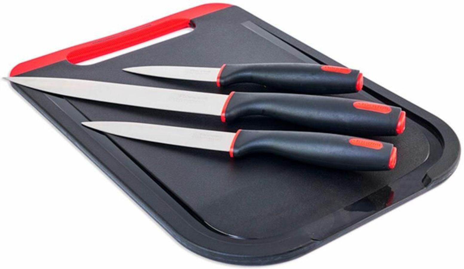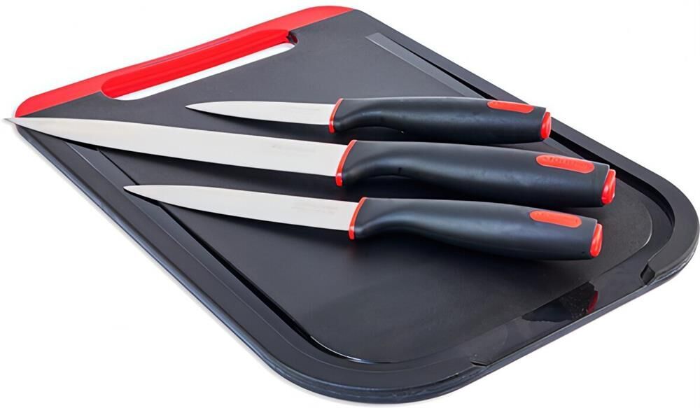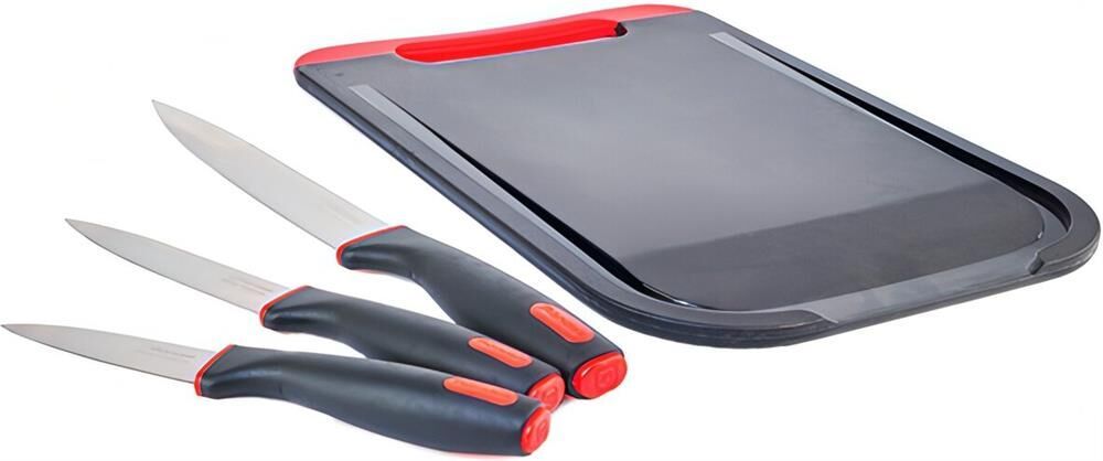 Комплектация: Нож разделочный 20,3 см -1 шт Нож универсальный 12,7 см-1 шт Нож для овощей 9 см -1 шт Доска разделочная -1 шт