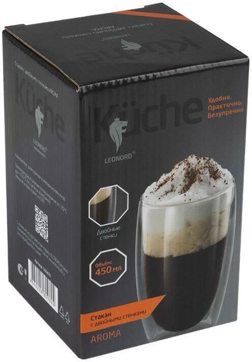 Стакан AROMA, объем: 450 мл с двойными стенками из боросиликатного стекла Материал: термостойкое боросиликатное стекло. Упаковка: цветная коробка + пуз пленка + белая бумага.