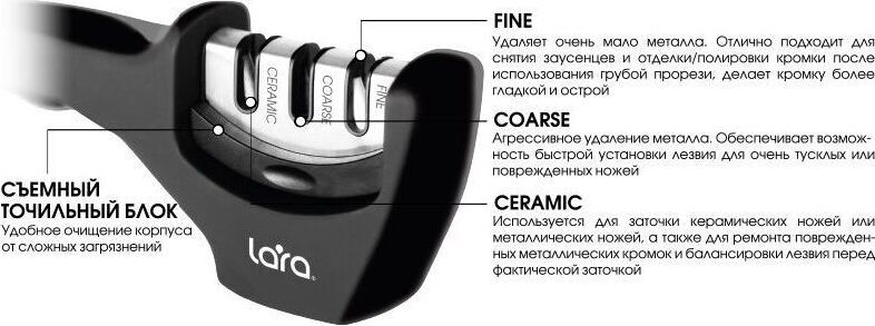 Материал - Пластик ABS. Назначение - Для стальных и керамических ножей. Прочие материалы - Нержавеющая сталь AISI 201. Материалы слота - Алмазный, Карбидный, Керамический. Полировка - Да