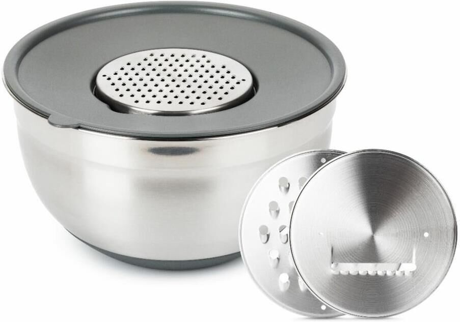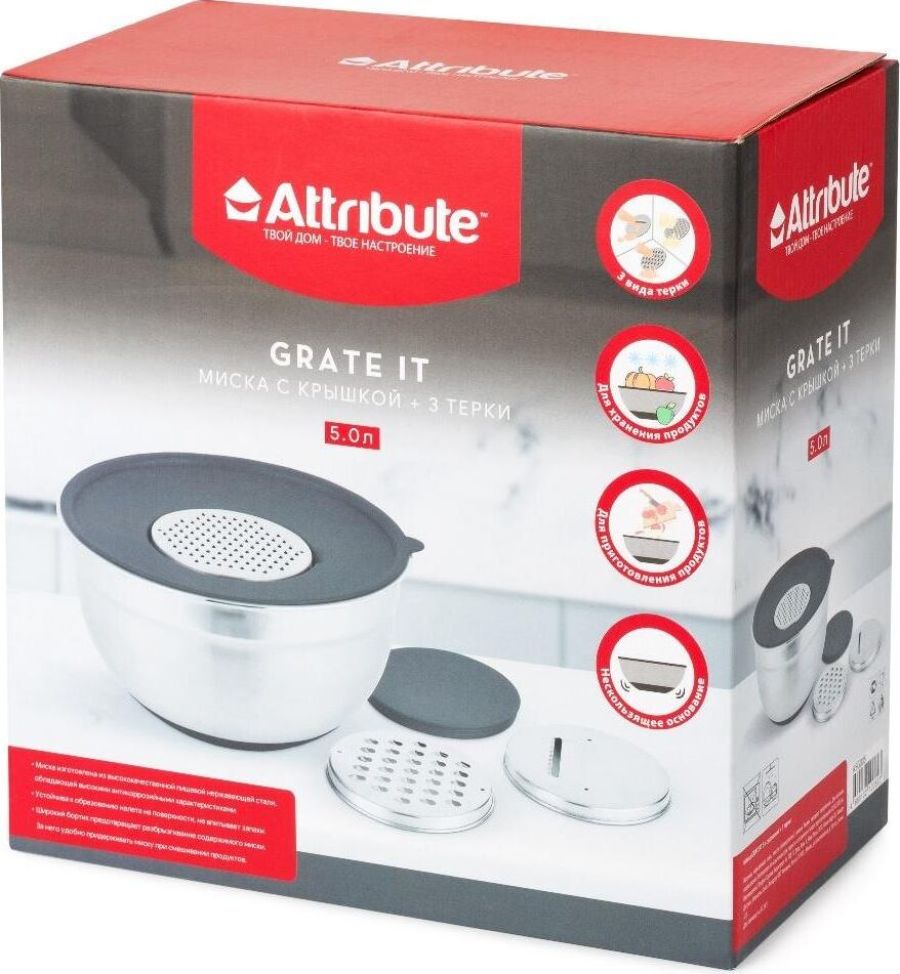 Комплектация: миска - 1 шт. терка крупная - 1 шт. терка мелкая - 1 шт. терка шинковка - 1 шт. крышка - 1 шт