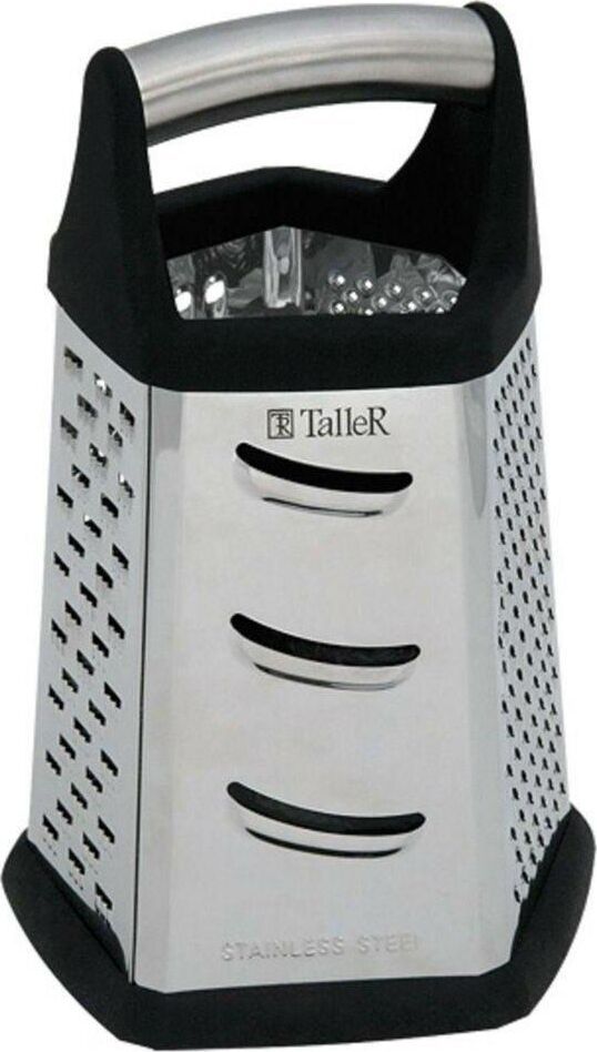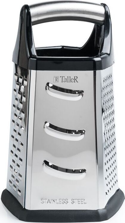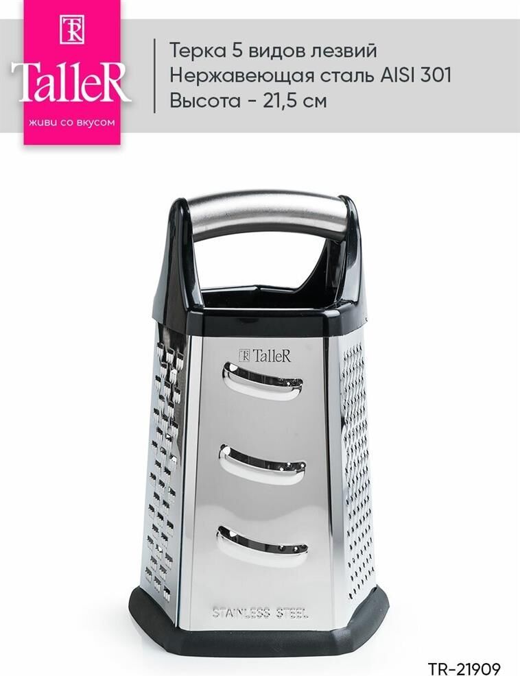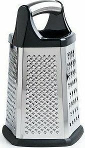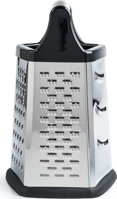 Терка 5 в 1, размеры 12,5*12,5*21,5. Удобная форма ручки обеспечивает надежную фиксацию в руке.Нескользящий силиконовый протектор на основании предотвращает скольжение во время использования и защищает поверхность от повреждений.