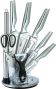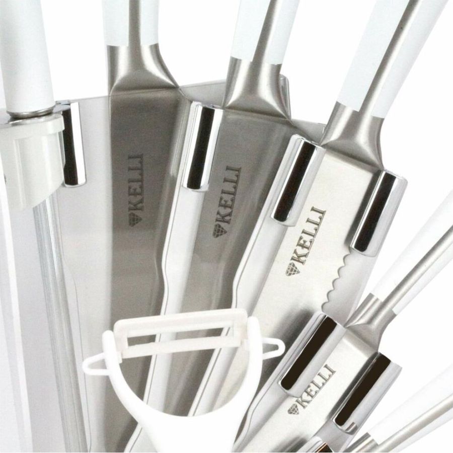 Комплектация: Топорик кухонный 16см . Нож поварской 20см . Нож хлебный 20см . Нож для резки 12см . Нож овощной 9см . Точилка . Ножницы . Овощечистка с керамическим лезвием