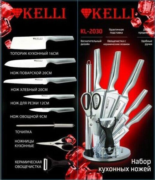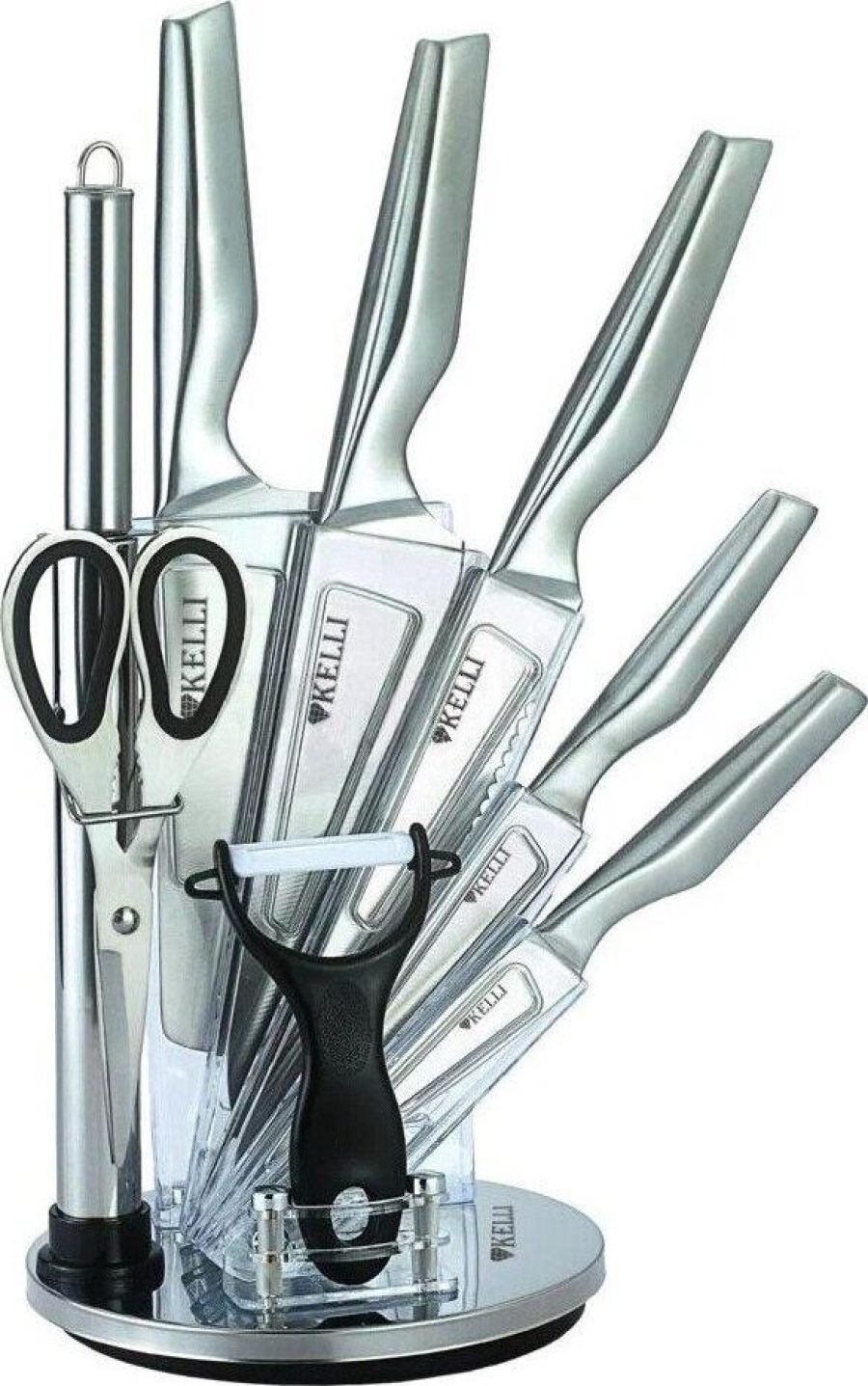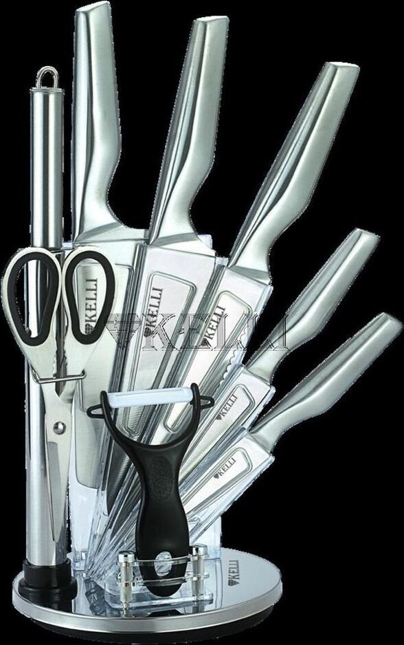 Набор кухонных ножей на подставке . Высококачественная сталь . 9 предметов . Топорик кухонный 16см . Нож поварской 20см . Нож хлебный 20см . Нож для резки 12см . Нож овощной 9см . Точилка . Ножницы . Овощечистка с керамическим лезвием. Острая режущая кромка . Легкая заточка . Удобные ручки . Восхитительный дизайн
